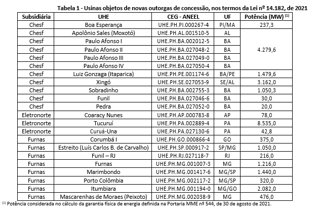 Cenário 1: outorga de novos contratos de concessão de geração para as UHEs da Tabela 1, com início de vigência em 1º janeiro de 2022, no regime de Produção Independente de Energia (PIE), com novas garantias físicas de energia definidas conforme Portaria MME nº 544, de 2021; e,