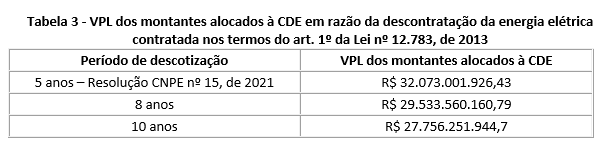 Assim, a Lei nº 14.182, de 2021, estabeleceu que a descotização se daria de maneira escalonada no tempo, oportunizando ao CNPE definir, dentro do prazo legalmente constituído de cinco a dez anos, o intervalo mais adequado. Deste modo, o Conselho deliberou pelo período mínimo legal de cinco anos visto que fazer o escalonamento de maneira muito dilatada, no tempo, também não se mostra tão vantajoso para o consumidor, conforme pode ser observado, na Tabela 3, que apresenta, além do valor presente líquido (VPL) dos montantes alocados à CDE para o prazo de 5 anos, simulação para a descotização em 8 e 10 anos.