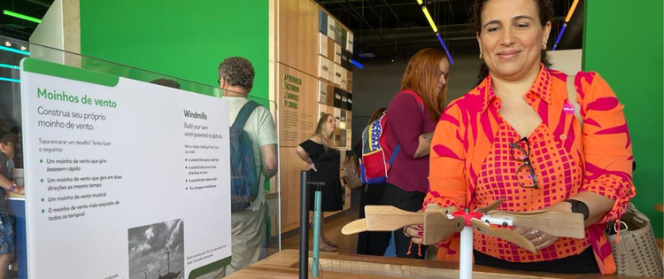 Samira Sana interagindo com o aparato “Moinhos de Vento”, cujo objetivo é compreender o processo de produção de energia elétrica por meio da transformação de energia. Foto: Tauan Alencar/MME