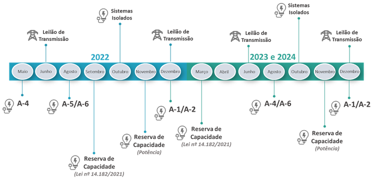 Em 2022 são indicados oito leilões de energia ou de reserva de capacidade: um Leilão“A-4” em maio, os leilões “A-5” e “A-6” em agosto, o Leilão de Reserva de Capacidade, nos termos da Lei nº 14.182, de 2021, em setembro, o Leilão para Suprimento aos Sistemas Isolados em outubro, o Leilão de Reserva de Capacidade na forma de potência em novembro e os Leilões “A-1 e “A-2” em dezembro.