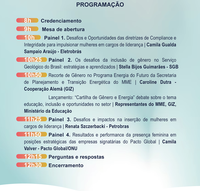 No evento, será apresentado o estudo “Recorte de Gênero no Programa Energia do Futuro da Secretaria de Planejamento e Transição Energética do MME” e o lançamento da “Cartilha de Gênero e Energia”, com debate sobre educação, inclusão e oportunidades no setor.