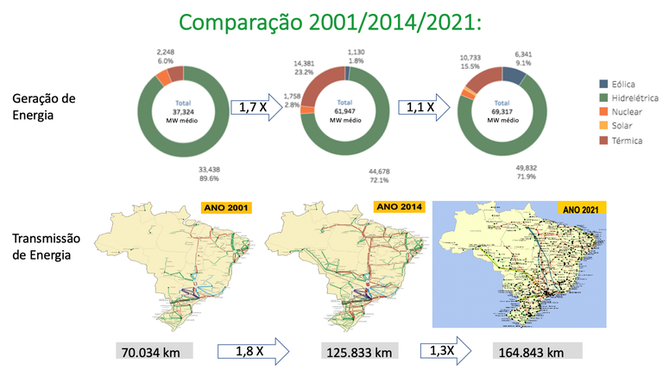 O infográfico abaixo apresenta a evolução da matriz elétrica brasileira e da expansão do SIN em três momentos, de 2001 a 2021, passando por 2014, que foi um ano em que a hidrologia também foi bastante desfavorável.