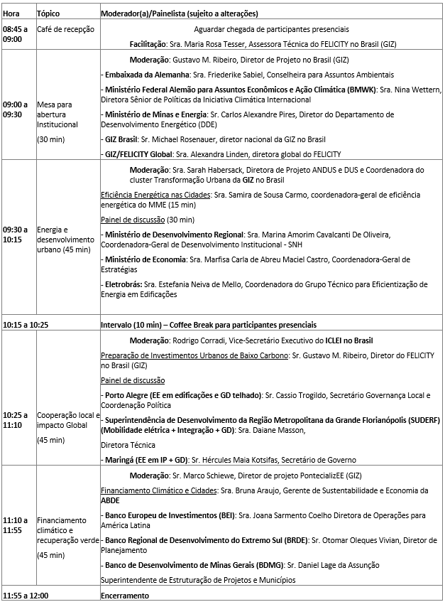 A sessão de abertura contará com a presença do diretor nacional da GIZ no Brasil, Michael Rosenauer, e da conselheira da Embaixada da Alemanha para Assuntos Ambientais, Friederike Sabiel. Estarão também presentes na mesa de abertura o diretor do Departamento de Desenvolvimento Energético (DDE) do MME, Carlos Alexandre Pires, e a diretora Global do Felicity, Alexandra Linden.