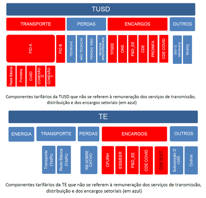 Basicamente, as tarifas cobradas dos consumidores estão divididas em duas partes: Tarifa de Uso do Sistema de Distribuição (TUSD) e TE (Tarifa de Energia). Essas duas partes possuem várias componentes que formam seu custo.