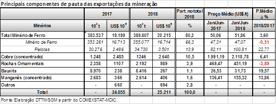 Considerando apenas a mineração , as exportações totalizaram US$ 25,2 bilhões (50,6%), um acréscimo de 4,8% em comparação ao ano de 2017. Desse valor, 10,5% foram referentes à participação nas exportações nacionais.