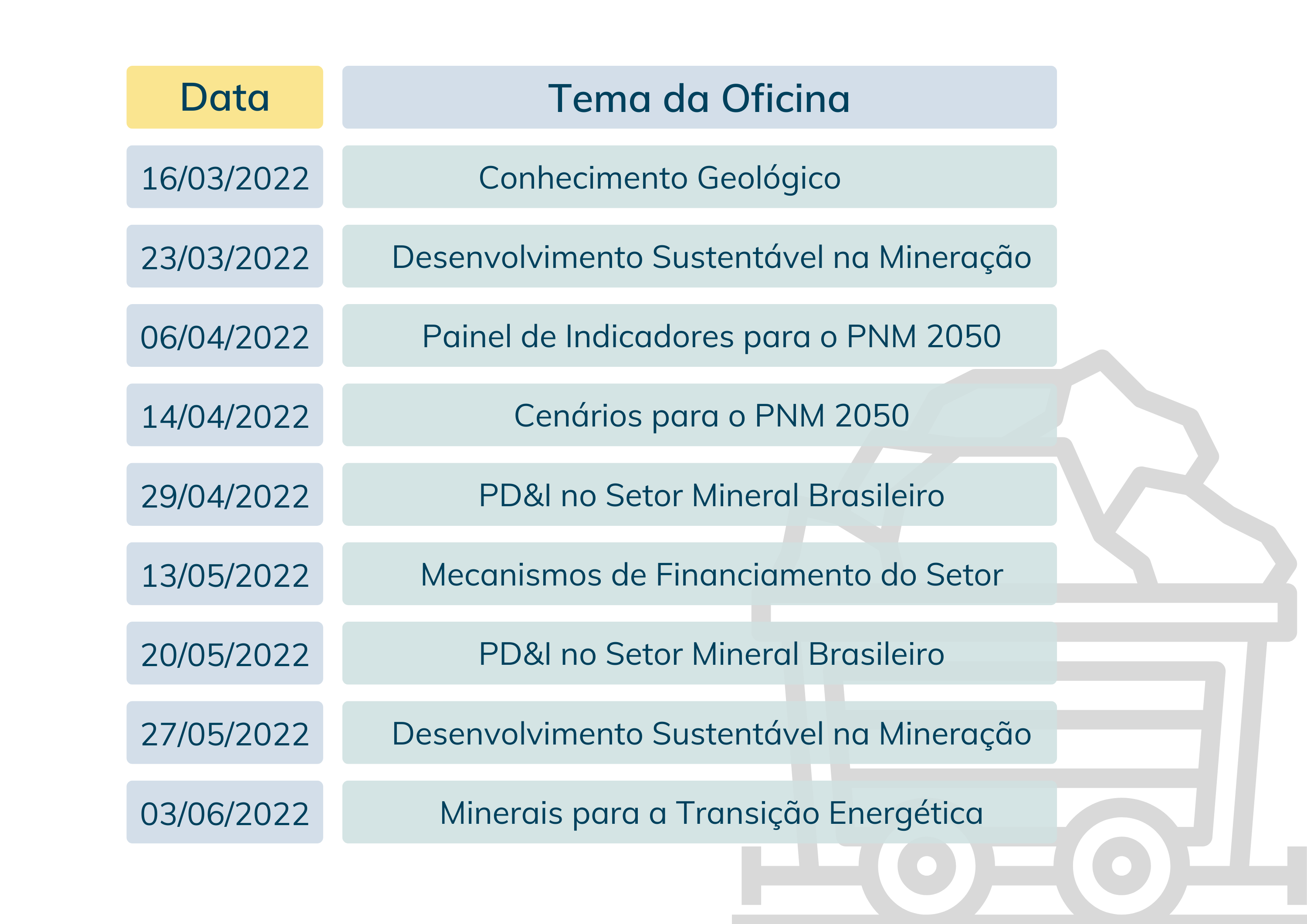 Entre março e junho de 2022, o Ministério de Minas e Energia, sob a coordenação da Secretaria de Geologia, Mineração e Transformação mineral, realizou 9 oficinas temáticas com o objetivo de obter subsídios complementares para a elaboração do PNM 2050.