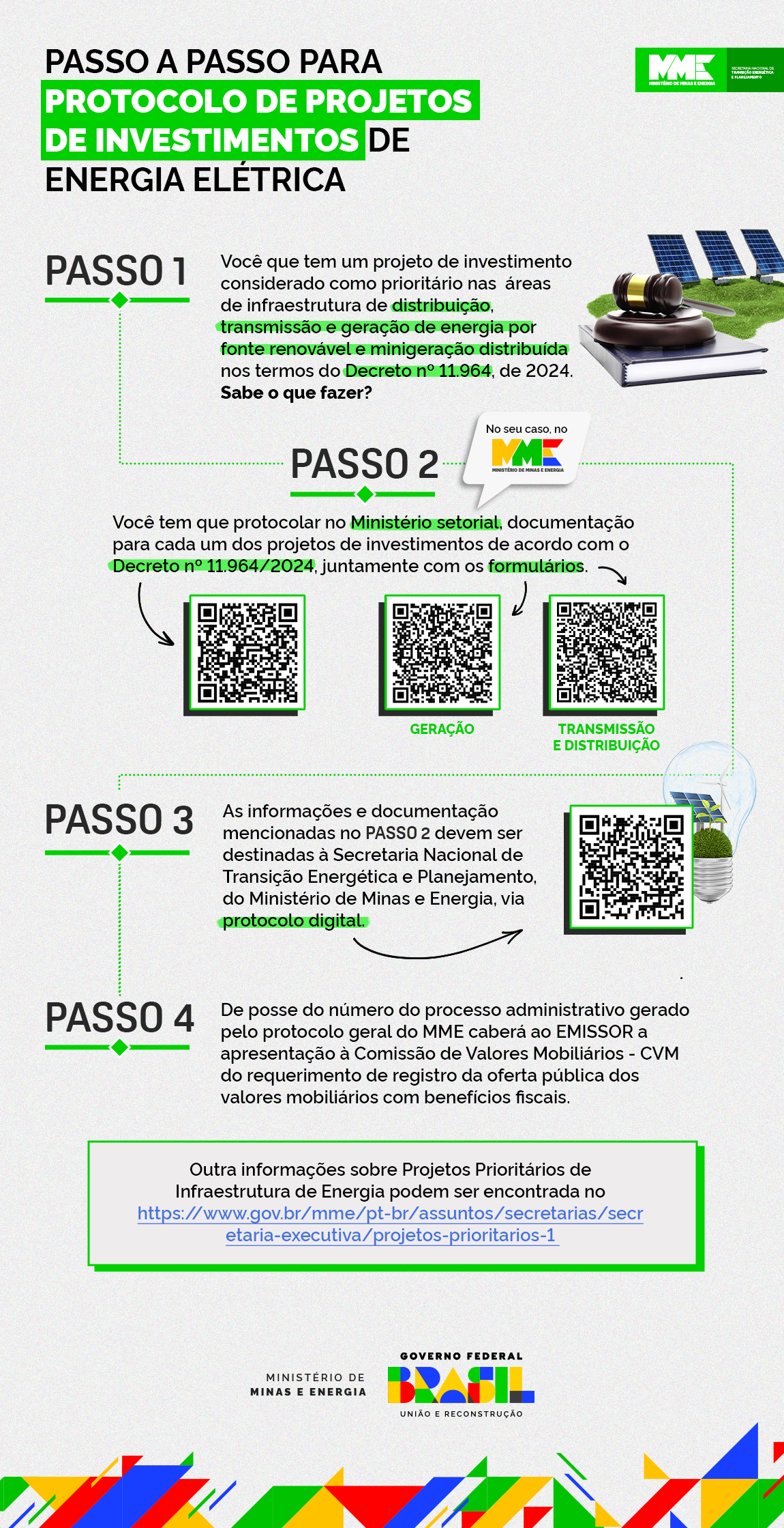 10. O Requerimento dos projetos da área de infraestrutura de geração, transmissão e distribuição de energia elétrica deve ser encaminhado à Secretaria Nacional de Transição Energética e Planejamento, do Ministério de Minas e Energia, acompanhado dos documentos e informações exigidas nas respectivas Portarias e no art. 8º do Decreto nº 11.964/2024.