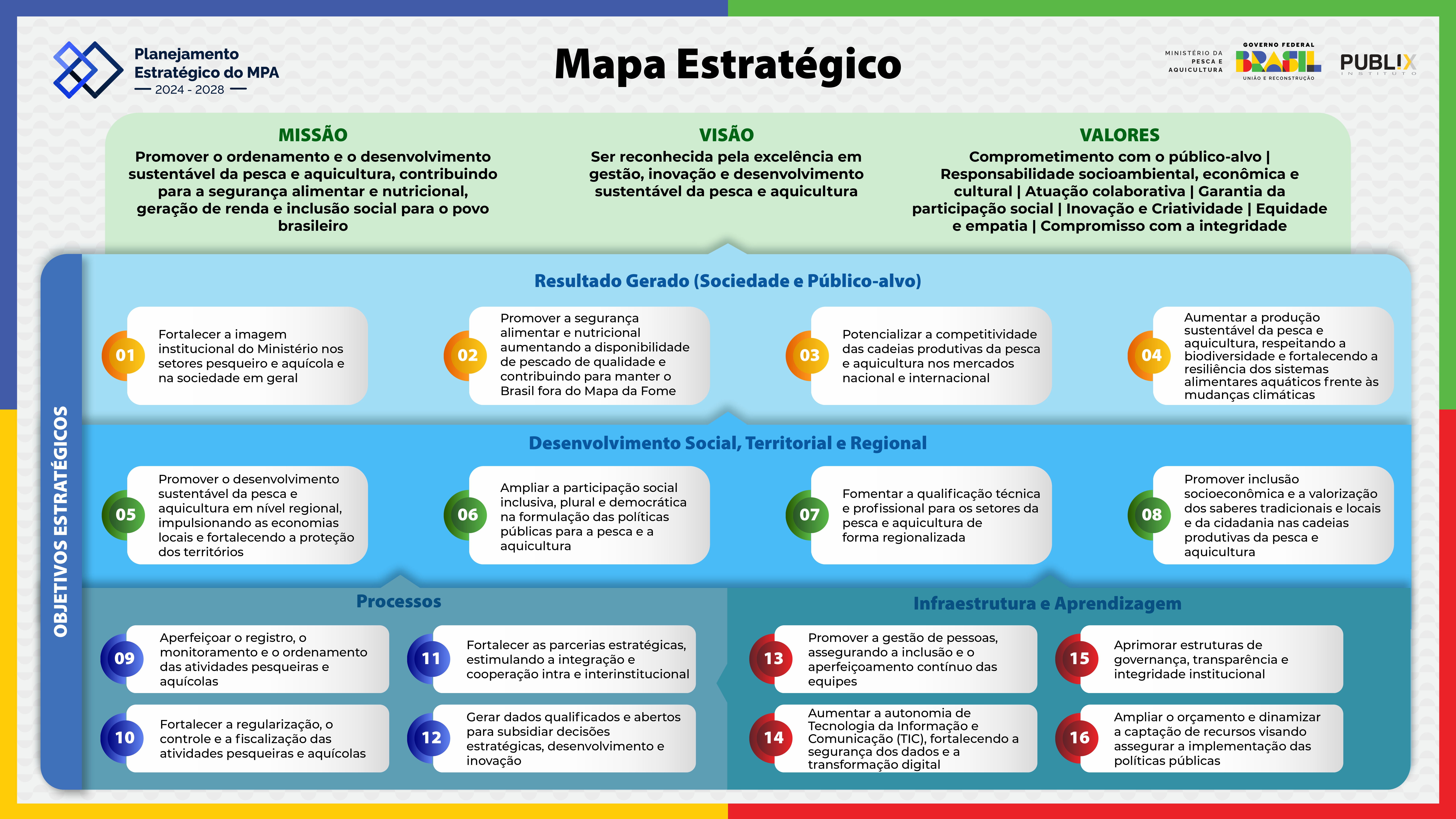 O Plano Estratégico Institucional (PEI) do Ministério da Pesca e Aquicultura (MPA) é o principal instrumento de orientação para as ações estratégicas do ministério. Por meio dele, o MPA define os objetivos prioritários para os próximos anos, alinha suas iniciativas aos compromissos do Governo Federal e reforça sua missão de promover o desenvolvimento sustentável da pesca e da aquicultura no Brasil.