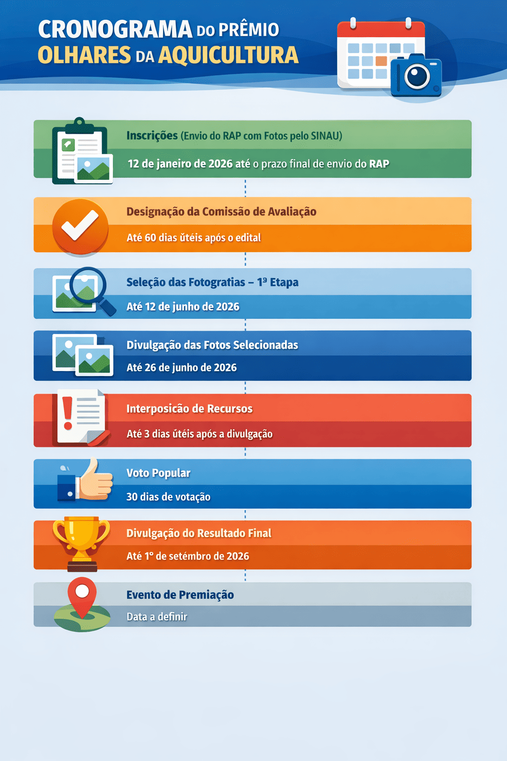A 3ª edição do Prêmio Nacional de Fotografia – Olhares da Aquicultura está integrada ao envio do Relatório Anual de Produção (RAP) e segue um calendário oficial que orienta todas as etapas do concurso — da inscrição à premiação.