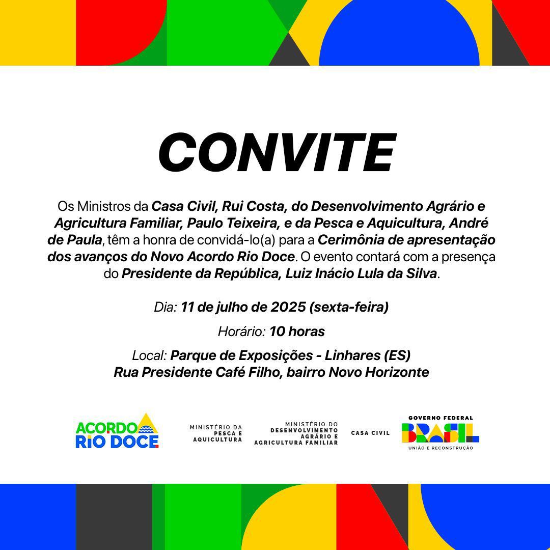 Participam da coletiva os ministros Paulo Teixeira (Desenvolvimento Agrário e Agricultura Familiar), André de Paula (Pesca e Aquicultura) e Márcio Macêdo (Secretaria-Geral da Presidência), além do secretário estadual de Recuperação do Rio Doce (SERD), Guerino Balestrassi.