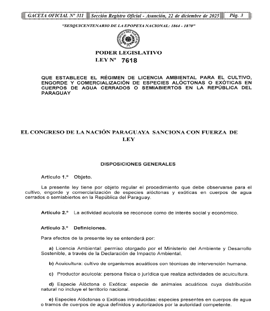 O presidente do Paraguai, Santiago Peña, sancionou a lei nº 7.618/2025, que cria o regime de licenciamento ambiental para o cultivo, engorda e comercialização de espécies alóctones ou exóticas em corpos d’água fechados e semiabertos no país. A decisão foi publicada na Gaceta Oficial (que equivale ao Diário Oficial da União no Brasil) no último dia 22 de dezembro.