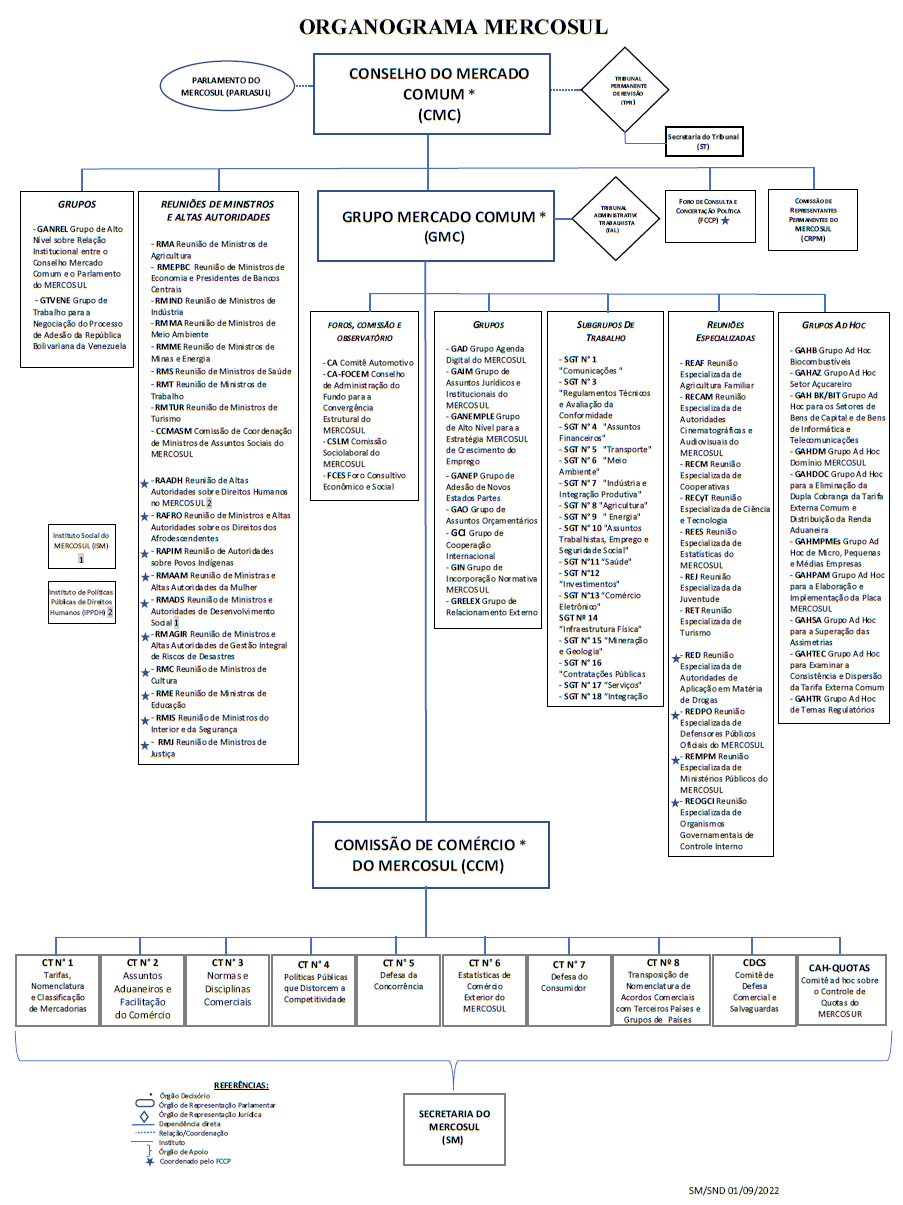 O Mercosul compõe-se de três órgãos decisórios: o Conselho do Mercado Comum (CMC), órgão superior do Mercosul, que conduz politicamente o processo de integração; o Grupo Mercado Comum (GMC), que vela pelo funcionamento cotidiano do bloco; e a Comissão de Comércio do Mercosul (CCM), incumbida da administração dos instrumentos comuns de política comercial. Assistindo aos mencionados órgãos existem mais de 300 foros de negociação nas mais diversas áreas, integrados por representantes de cada Estado Parte.