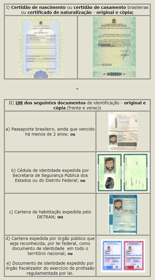 I) Passaporte (que pode ser substituído pela carteira de habilitação americana, Driver's License, somente se o genitor for nascido nos EUA).