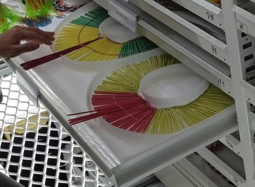Depois dessa apresentação, a comitiva conheceu parte do acervo depositado na reserva técnica de adornos e plumárias. Eles viram peças de diferentes etnias e algumas coleções, como a formada pelo antropólogo Darcy Ribeiro, um dos fundadores do MI. Puderam também apreciar peças produzidas com materiais alternativos, como os cocares Kayapó feitos com canudos plásticos, no lugar de penas animais, e os colares Marubo confeccionados com contas de PVC em substituição às contas de conchas de aruá. Esses são alguns exemplos que demonstram como os povos indígenas podem utilizar em sua produção artesanal e em seu viver coisas do mundo dos brancos, afirmando as suas identidades e reproduzindo suas culturas.
