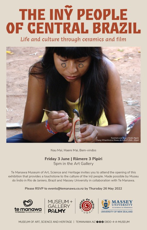 “O Povo Inỹ do Brasil Central: vida e cultura retratadas em cerâmica e filme” é o tema da exposição que está sendo inaugurada hoje, dia 3 de junho, no Museu Te Manawa, na cidade de Palmerston North, na Nova Zelândia. O evento é resultado de uma parceria do Museu do Índio e do Programa de Pós-Graduação em Linguística da Faculdade de Letras da Universidade Federal do Rio de Janeiro (UFRJ) com as instituições neozelandesas Universidade Massey e o Museu Te Manawa de Arte, Ciência e Patrimônio.