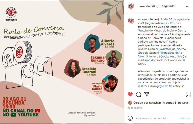 As ações extramuros do programa Museu do Índio Viajando deram origem ao projeto Museu do Índio Viajando nas Redes. Por meio deste projeto, em 2021, foram lançados 21 vídeos que integram diferentes iniciativas, entre elas, o ciclo de vídeos Canaremundê Opeh – Puri em Sol , em parceria com o Museu Villa-Lobos; o ciclo Ana Pará Poty Kariri ; e a série Viver, Lutar, o modo de ser Guarani , lançada em agosto, em homenagem ao Dia Internacional dos Povos Indígenas, nas redes do Museu do Índio e no site da Companhia Paulista de Trens Metropolitanos (CPTM) de São Paulo. Em 2021, houve também a produção e lançamento da mostra virtual Os Céus dos Povos Originários , em parceria com o Museu de Astronomia e Ciências Afins (MAST).