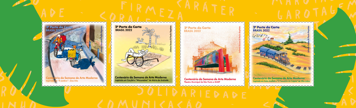 As celebrações do centenário da Semana devem ter essas questões em conta. Nesse sentido, os selos postais também devem atualizar-se e tentar cumprir o desafio de representar o Brasil enquanto um espaço diverso e impermanente, permeado por identidades múltiplas e com diferentes níveis de acesso ao poder social e simbólico. A emissão “Centenário da Semana de Arte Moderna” é um esforço, feito em conjunto com os Correios, o IBRAM e a Casa da Moeda, de repensar os símbolos criados em 1922 e como eles podem ser relidos e atualizados no tempo presente. Contudo, ao homenagear os principais artistas participantes da semana, não questionam o seu legado, construído e lapidado ao longo do tempo e que está claramente vivo no imaginário dos artistas responsáveis pelos selos. Afinal, toda arte é imaginada e executada de acordo com o lugar social de quem a produz.