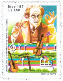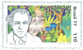 Heitor Villa-Lobos figura em selo postal em dois momentos. Em 1977, aparece na série “Compositores brasileiros”, ao lado de Chiquinha Gonzaga e Noel Rosa. Em 1987, há homenagem ao centenário do músico. Em ambos os casos, é possível perceber que o retrato de Villa-Lobos aparece em um fundo com elementos considerados típicos da “brasilidade”, relacionados à fauna e à flora. Assim, os selos reforçam a ligação do maestro com a construção de um estilo de música que se pretendia genuinamente brasileiro. |