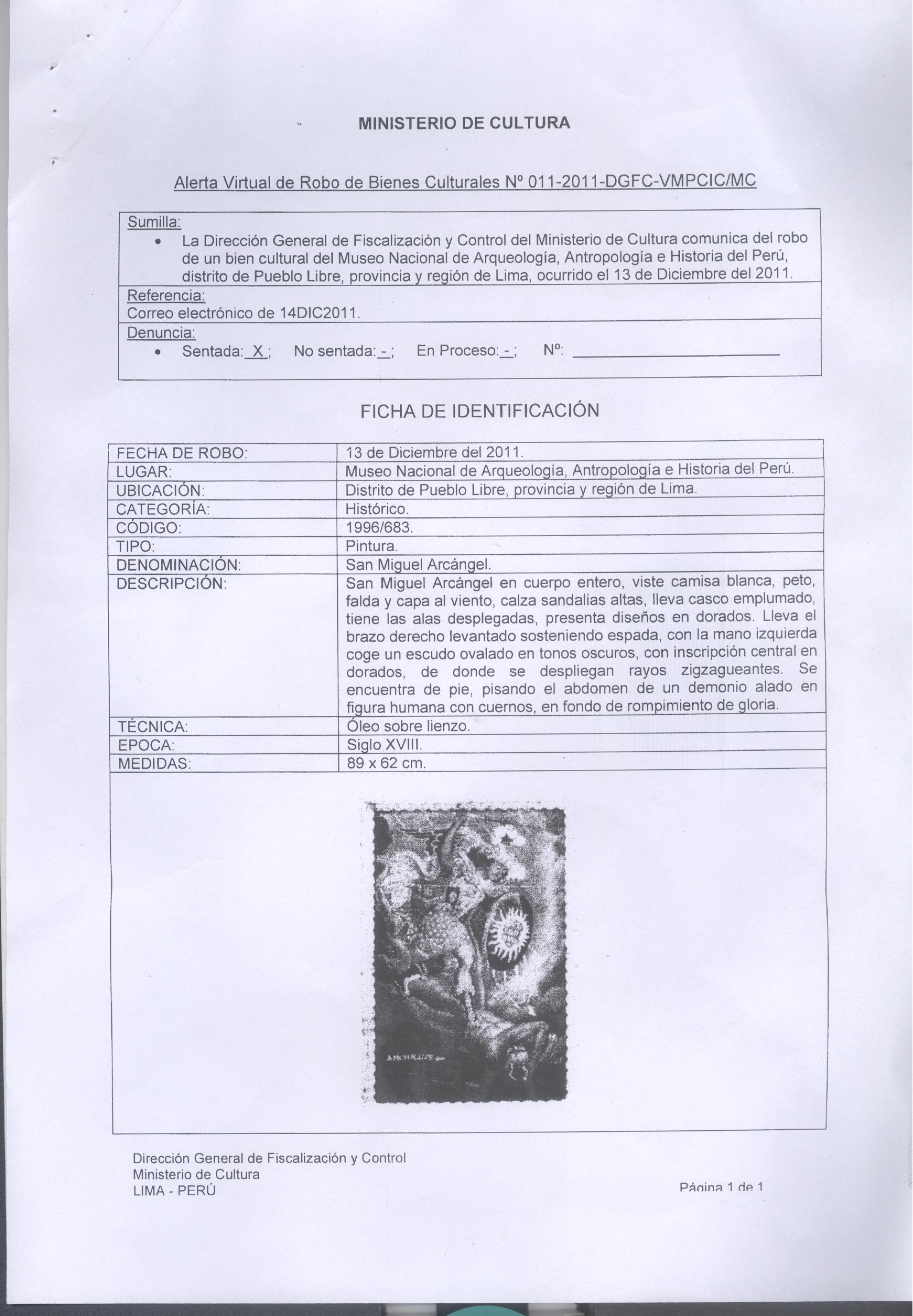 O Ministério da Cultura do Peru anunciou que foi roubada uma das obras do Museu Nacional de Arqueologia, Antropologia e História do Peru (foto), localizado em Lima.
