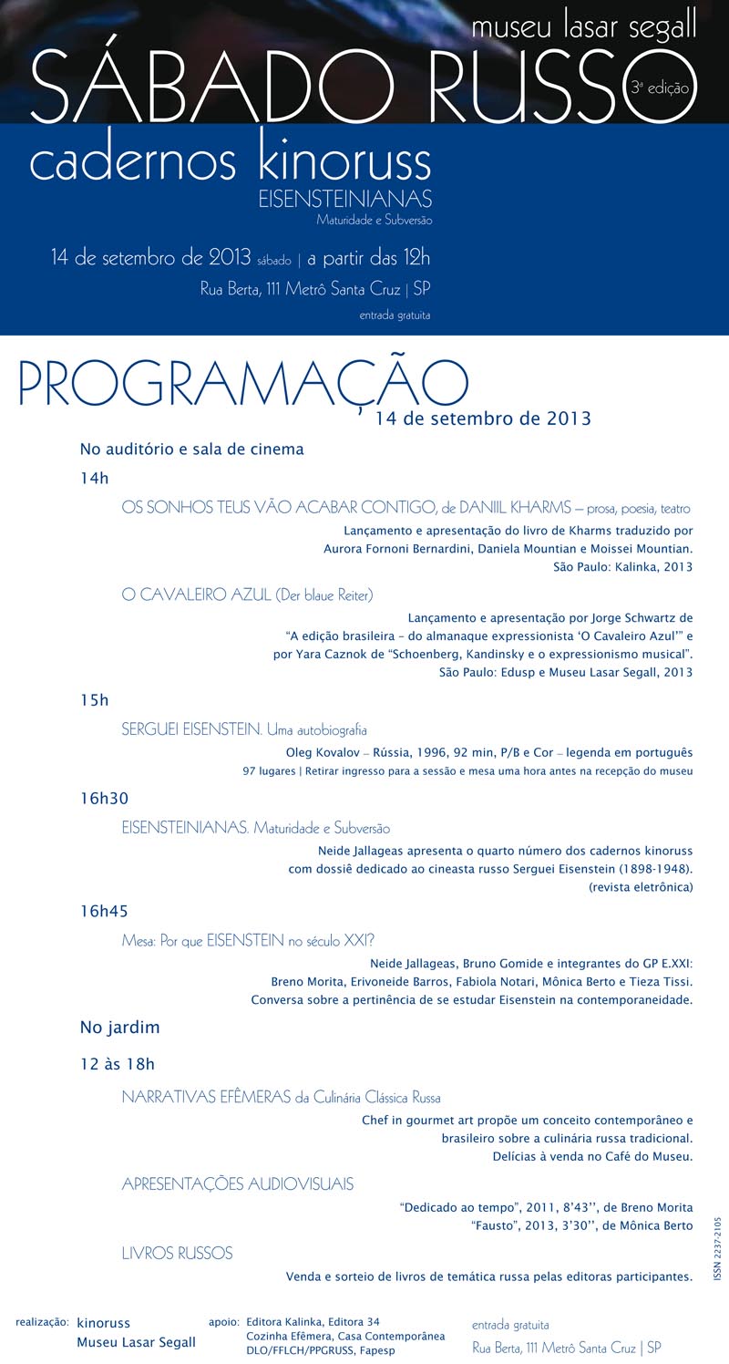O evento acontece em torno do lançamento do quarto número da Kinoruss – revista eletrônica dedicada à pesquisa e publicação de textos teóricos e artísticos cujo eixo é o cinema russo. Em paralelo, oferece uma programação relacionada ao cinema e às artes russas.