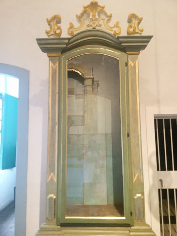 Datado do Século XVIII, confeccionado em madeira entalhada, ensamblada, policromada e dourada, o artefato não possui autoria conhecida e tem as seguintes dimensões: alt. 2,30m X larg. 1,19m X prof. 60cm. Seu coroamento é entalhado em volutas, a porta frontal de vidro em meia cana sustenta-se por duas dobradiças no sistema macho e fêmea, abrindo pela direita. Totalmente policromado, tem molduras em relevo e decoração inferior com extremidades recortadas e relevadas e destaques em douramento sob mordente.