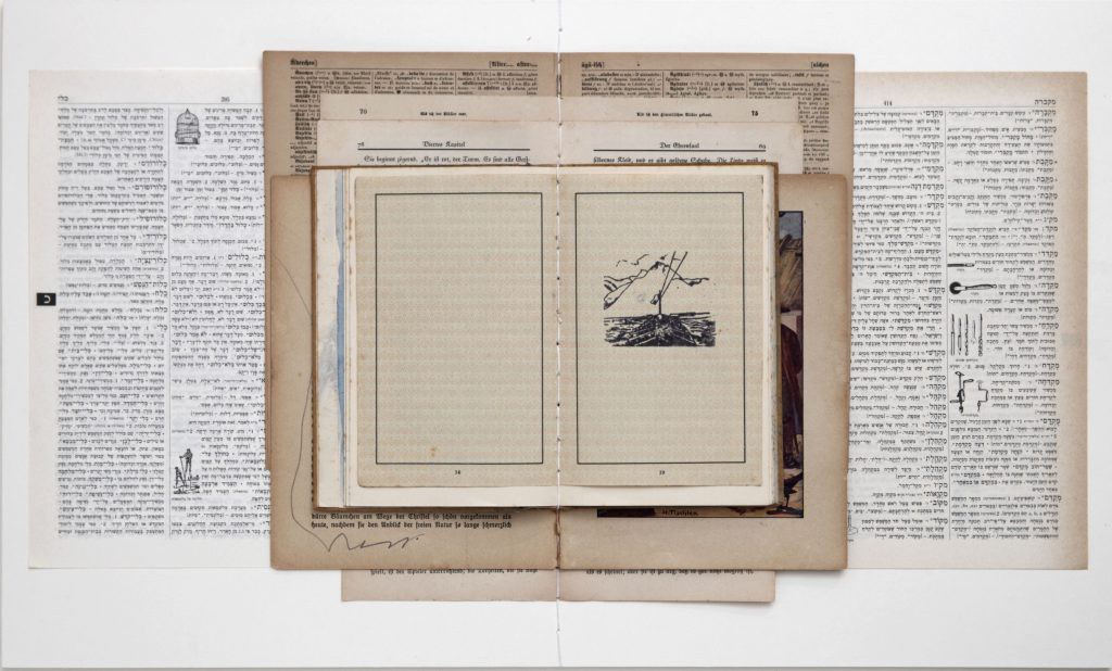 A justaposição de imagens é um método recorrente na produção da artista e está presente não apenas nessas imagens com cunho informativo, mas na série em que agendas em branco são costuradas ou sustentadas por ímãs. Livros coletados durante a remodelação da biblioteca da Associação Scholem Aleichem (Rio de Janeiro) também são costurados e deixam entrever a presença do iídiche em sua superfície. Costurar esses papéis é atribuir peso a eles e nos leva a refletir tanto sobre o vazio daqueles espaços em branco destinados a anotações, quanto ao silenciamento do iídiche, idioma composto pela costura da apropriação de várias línguas.