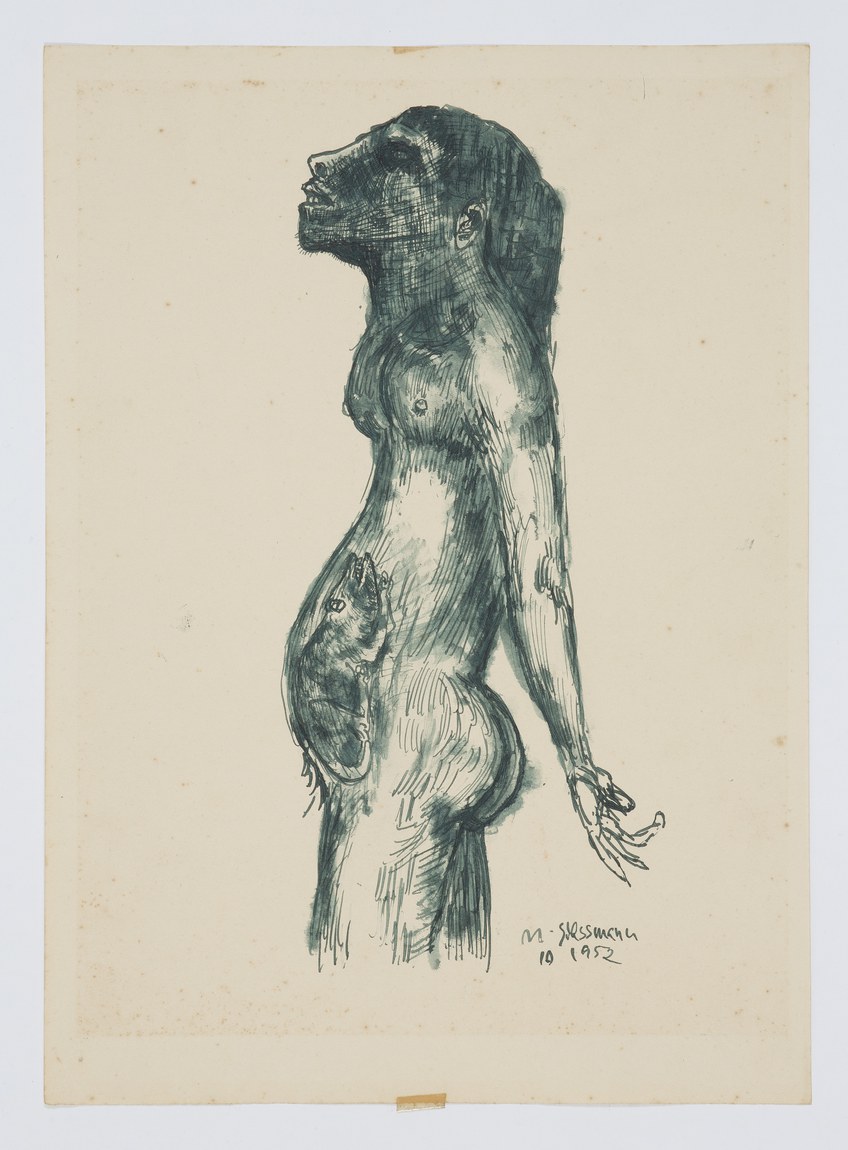A figura da mulher que traz em seu ventre um animal, camaleão, gambá ou porco, e que o embala como uma boa mãe, envolvendo-o em seus braços enquanto de suas costas se arvora a morte também mantém referências com o universo fantástico de Kubin (O Ovo, 1902). O sonho, a mescla de seres, a bizarria se sucede em seres que saem ou vivem presos a ventres femininos ou são acarinhados em seus colos. As bocas destes seres, às vezes, sorriem, escancarando-se para o espectador como a desafiá-lo para que ele tente decifrar o seu sentido, ou simplesmente para desviá-lo para outro lugar, longe dali. Que retornem aos espaços e conversações sobre cultura, sobre o mundo circundante, com o blá-blá-blá infindável das rodas de convivas aborrecíveis. O lugar da arte é outro. É o lugar de Goeldi, de Kubin, eventualmente de Redon e de mestres de outrora, como Urs Graf, Hans Holbein o Jovem, Leonardo Da Vinci, Michelangelo, etc.