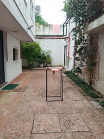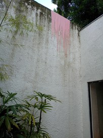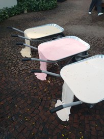 A presente exposição apresenta um conjunto de cinco trabalhos do artista que demonstram o esgarçar da linguagem de suas pinturas para o espaço da tridimensionalidade, engajando-se assim com a arquitetura do museu e suas particularidades, ao mesmo tempo que sublinhando as características fragmentárias de sua obra. Sobre certos pontos da instituição, janelas, coberturas, paredes e parapeitos, surgem peças de silicone em formato de tinta escorrida, fragmentos de pintura que aqui assumem a liderança. Em outros, se apresentam estruturas verticais de ferro, possíveis mastros de bandeira desembandeirados ou estruturas desmontadas, poças solidificadas de silicone abancadas sobre uma delas. Constituem manchas carregadas de um embevecimento táctil, desligadas de um espaço. Mesas de plástico banidas de seus bares e coloridas num delicioso dégradé de garridas cores são implantadas em espaços verdes, enquanto carriolas prístinas de alumínio vomitam de seus interiores jorros quase jocosos de cores em tom pastel.