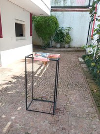 Uma estrutura, da série Sem eira nem beira, é o ponto central das híbridas e desmembradas investigações de Magila. Elementos constitutivos da pintura são nela sugeridos em materiais estranhos à prática, à guisa de mapas topográficos moldados em camadas solidificadas de cor, e suspensos numa estrutura de ferro, retângulo isolador, gaiola, quem sabe, do mundo. A beleza dessas formas siliconadas e as linhas sinuosas que elas desenham dão origem em seu interior a uma barra de ferro marcada por seus usos anteriores, torcida por sua história pregressa, impressa sobre si mesma. Antigo material de construção, ela aqui reaparece modificada, mas não alterada, as marcas de oxidação alimentando a beleza das aglomerações de silicone, das quais se origina. Ao mesmo tempo, elas retroalimentam as qualidades vívidas da barra resgatada.