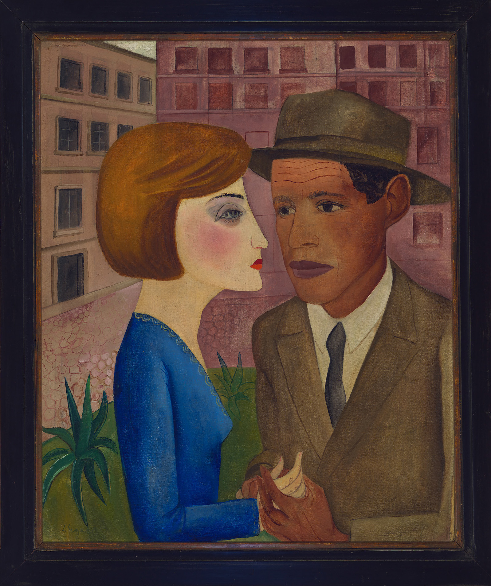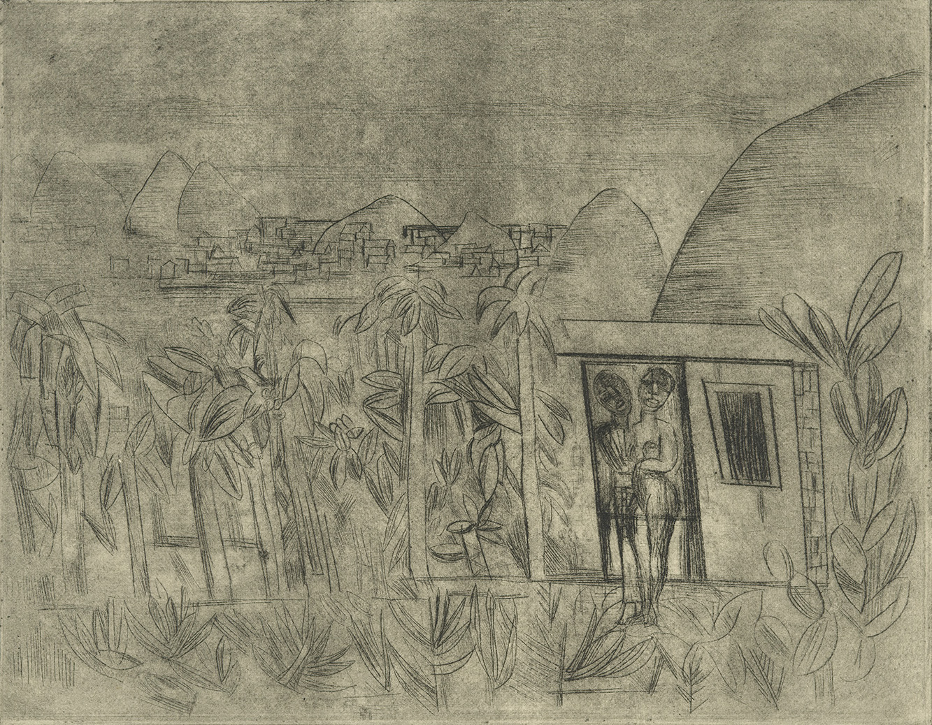 O que se destaca, no alto da favela, é a massa vegetal abundante, com bananeiras e outras plantas da roça, além de duas pequeninas palmeiras: uma vegetação que, reconhecida pelo artista, deixa de ser “luxuriante”, para ganhar a realidade específica de alimento e participar da reprodução da vida. A porta do casebre emoldura um casal: a mulher caricaturalmente negra, o homem apenas uma silhueta. Ambiguamente, nota-se que o artista está no interior da comunidade, mas o seu ponto de vista é externo, de alguém que observa sem se anunciar – algo que, somado ao fato da cena remeter ao Jardim do Éden, demonstra como o referencial exotista ainda permeia o trabalho de Segall.