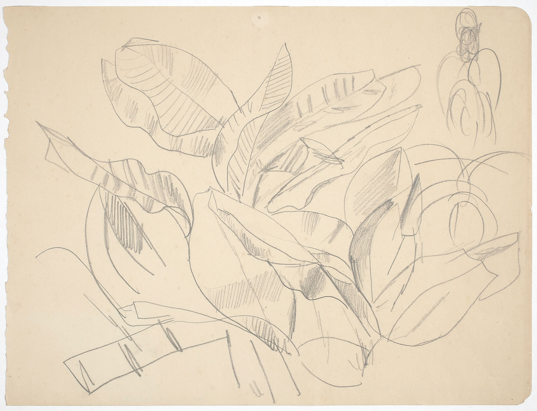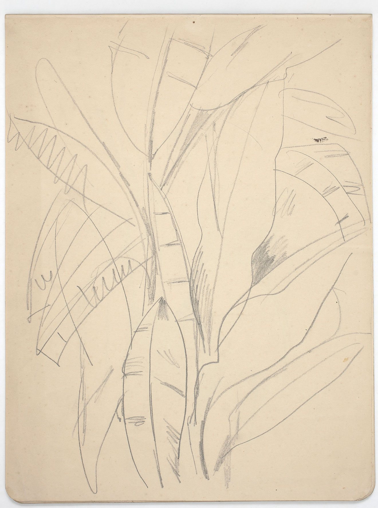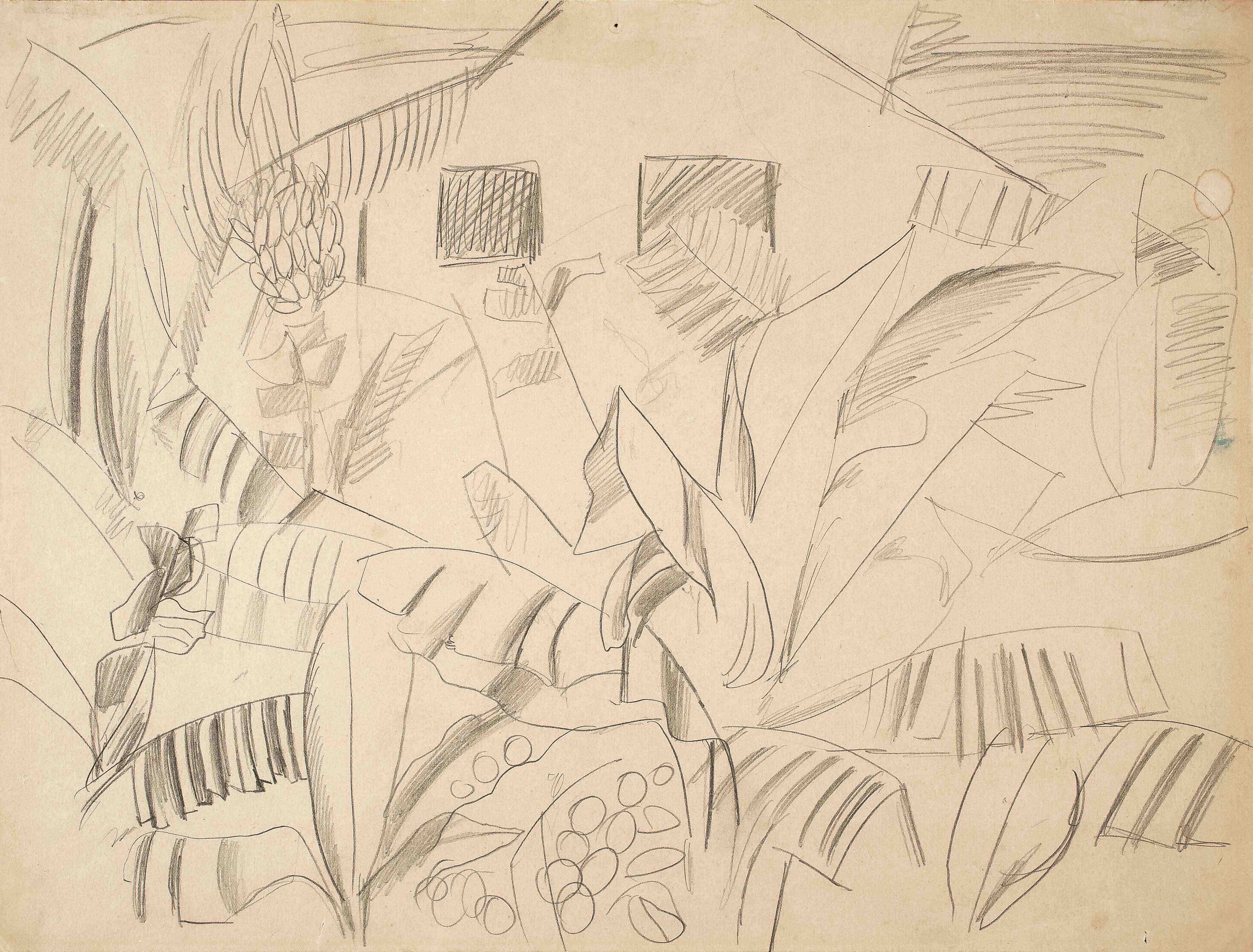 Estes esboços para futuros trabalhos resumem as possibilidades de desenvolvimento de uma poética a partir da vegetação. Três caminhos são cogitados por Segall. O primeiro esboço, de um sol infantil e três folhas de bananeira estilizadas, é um exercício de síntese em torno da noção de tropicalidade. No segundo esboço, a vegetação tropical envolve uma figura de mulher, e demonstra como a associação exotista entre a natureza e o feminino (e especificamente a mulher negra), é o mote de vários trabalhos da “fase brasileira”. No terceiro desenho, a bananeira é um tema em si; são exploradas as possibilidades de composição a partir de diferentes partes da planta, na chave da abstração e geometrização cubistas.