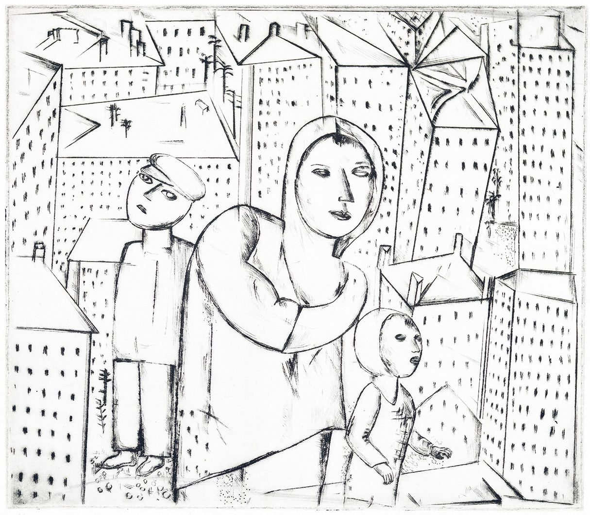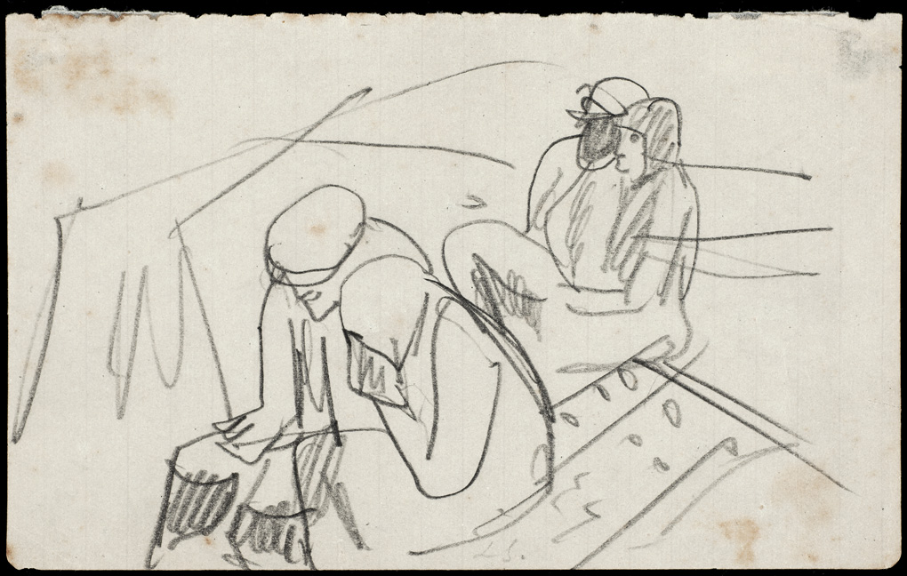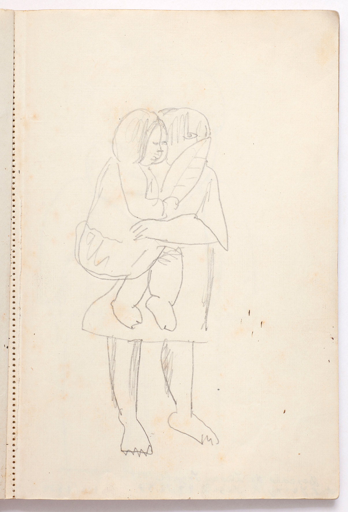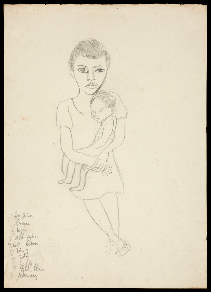 O desenho Mãe com filho é provavelmente um desenho de anotação para as figuras centrais da pintura Morro vermelho, 1926 (óleo sobre tela, 115x95cm, coleção particular, São Paulo).