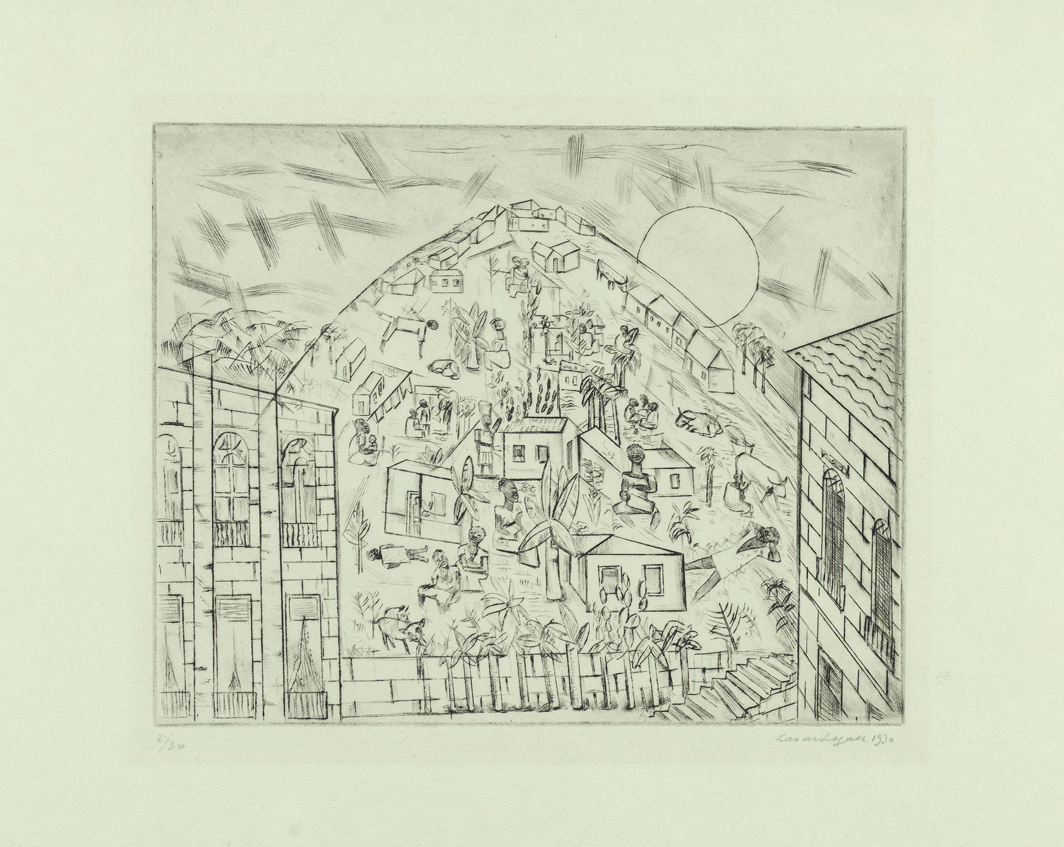 A paisagem física e humana do Rio de Janeiro mobiliza intensamente a sensibilidade de Segall, que ultrapassa o encantamento exotista pelo cenário natural. Em suas obras, encontram-se justapostas a representação de uma natureza edênica, intocada, e de uma natureza historicizada que, sem desconsiderar os atributos naturais da paisagem, consegue expressar as desigualdades socioespaciais, de classe e raça presentes na sociedade brasileira. A capital fluminense é lida como um mosaico, unidade na qual cabe a diferença, e cuja maior expressão é a relação entre a cidade e o seu outro, a favela. Nas gravuras, o artista observa a favela a partir da cidade; sobe o morro e vê a favela de perto e de dentro. Finalmente, no alto, avista novamente a cidade, que aparece transformada. As bananeiras surgem em meio à trama intrincada da vida no morro, junto com pessoas, animais e uma grande diversidade vegetal. Sua presença indica o caráter profundamente humanizado e solidário que o artista confere à planta, que passa a simbolizar a relação empática com os elementos negros, populares e femininos da nacionalidade.