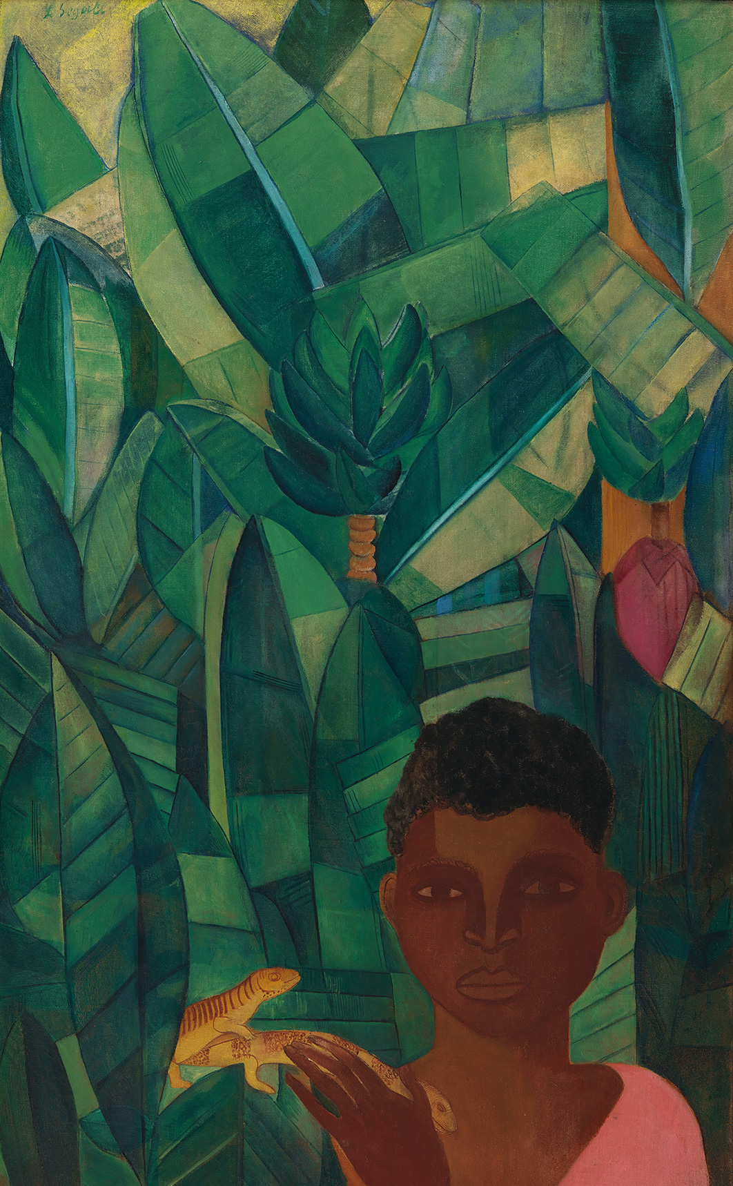 A figura do menino é enquadrada de forma pouco convencional, descentralizada e rebaixada – cedendo espaço para a plantação, composta de folhas recortadas, um cacho e um coração de bananeira, em cores luminosas. Segundo Mário de Andrade, Segall realiza aqui uma “tapeçaria”, “uma das invenções mais admiráveis de transposição da realidade para a arte que se tem conseguido com a bananeira”. Em vez de um retrato convencional, surge um retrato do bananal.