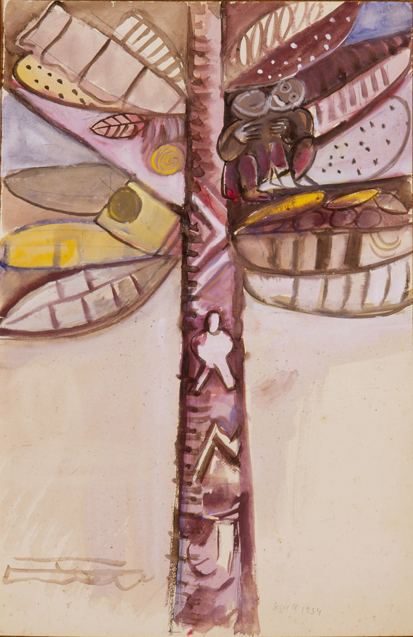 Este totem composto por uma coluna decorada com desenhos “tribais” e encimada por folhas de desenhos variados não chegou a ser construído, mas complementaria os esculturais cachos de bananas que decoravam o salão. Sua estrutura lembra a de um coqueiro – e a presença de “cocos” reforça essa percepção –, porém algumas das folhas são de bananeira; os macacos empoleirados também remetem a essa planta. Segall intencionalmente funde dois dos principais símbolos vegetais da tropicalidade, associando a eles outros índices de primitivismo e criando, assim, um super estereótipo da flora brasileira. Esse totem ironiza – em sua proposição enquanto “montagem vegetal” – características-chave do pensamento exotista, como o desconhecimento do outro. Ele se apropria do exotismo para criticar o próprio exotismo. A dimensão sagrada do totem (um elemento de adoração que, nos clãs primitivos, conectava um ser humano a um ser natural) é dessacralizada pelo caráter profano do carnaval.