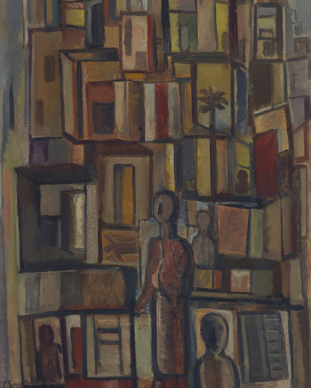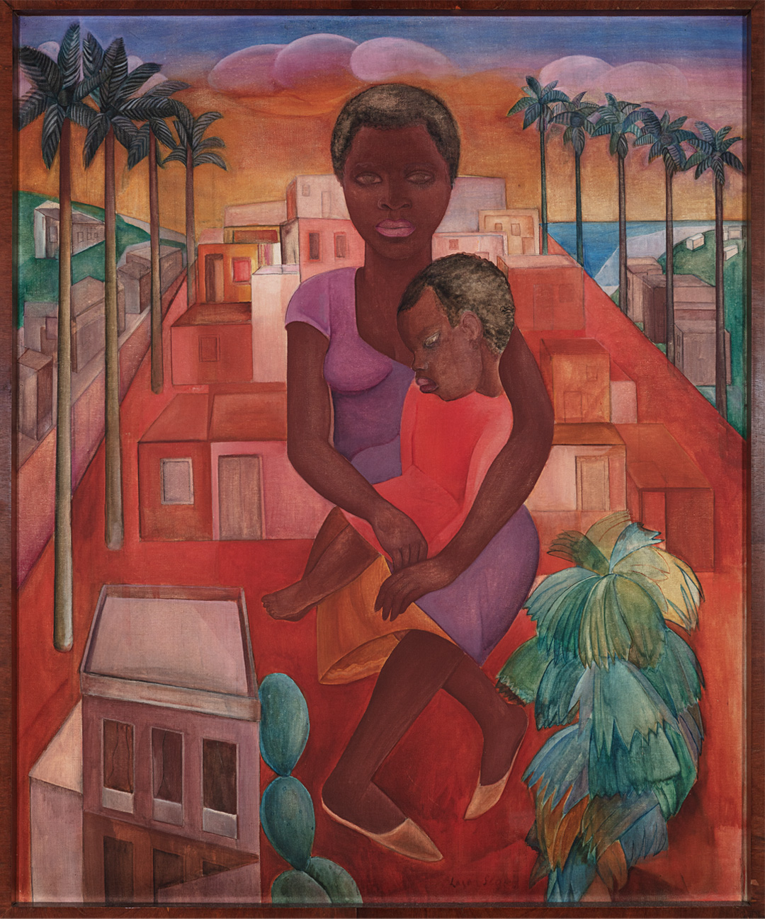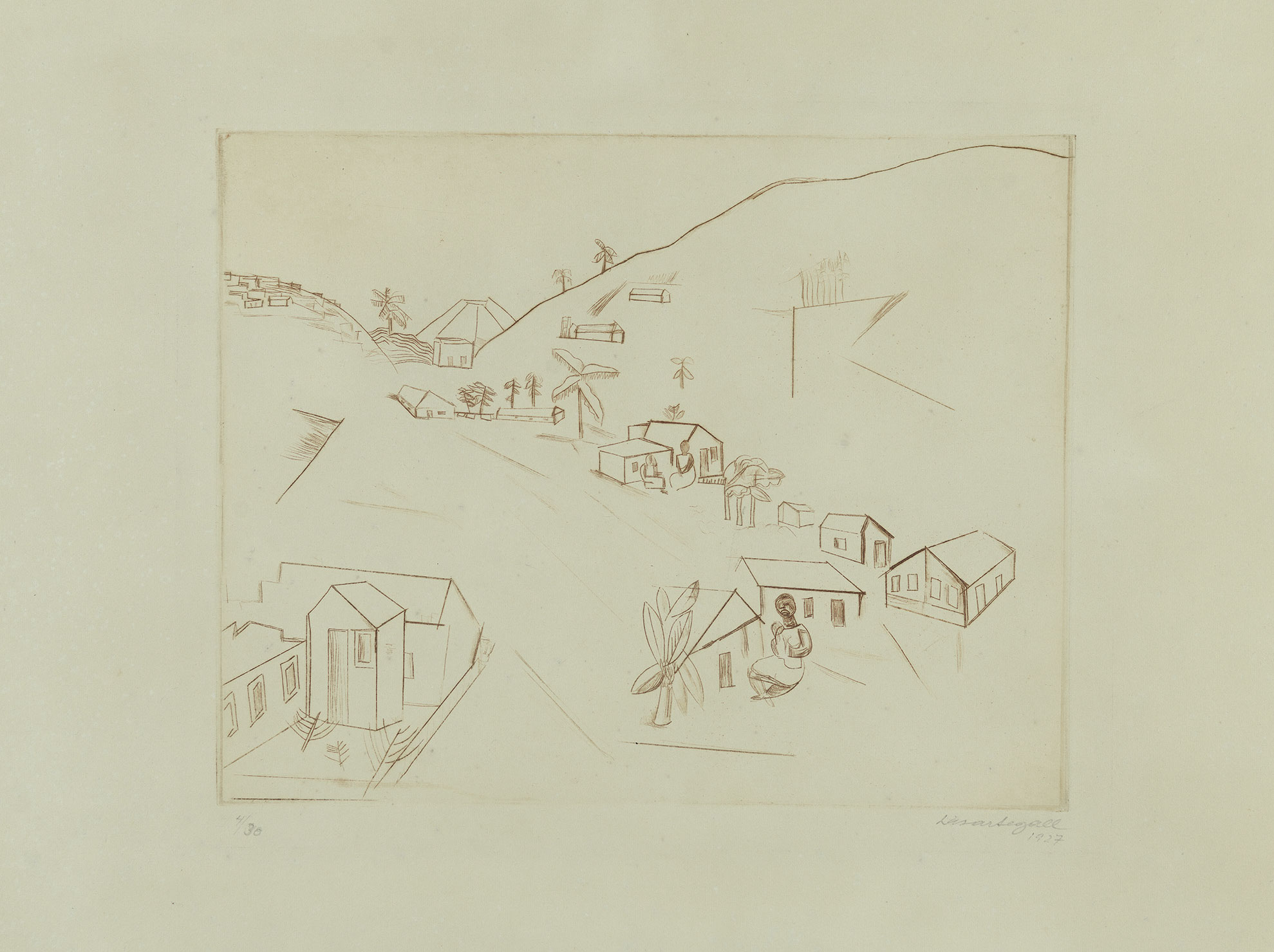 A favela é inicialmente vista de fora, a partir da cidade. Uma forma ogival e estável delimita o morro; o seu interior mais instável. Uma infinidade de pequenas figuras transforma o terreno em comunidade, e a bananeira aparece diversas vezes. Uma “grande bananeira” é a maior figura da composição, associada à mulher negra que amamenta uma criança. A planta símbolo da tropicalidade exotista (que desconhece a cultura do outro), é problematizada pela insistência em recriá-la artisticamente e reconhecê-la considerando o seu contexto. Segall não se importa mais com “plantas raras”, pois encontra possibilidades na planta comum e compartilhada.