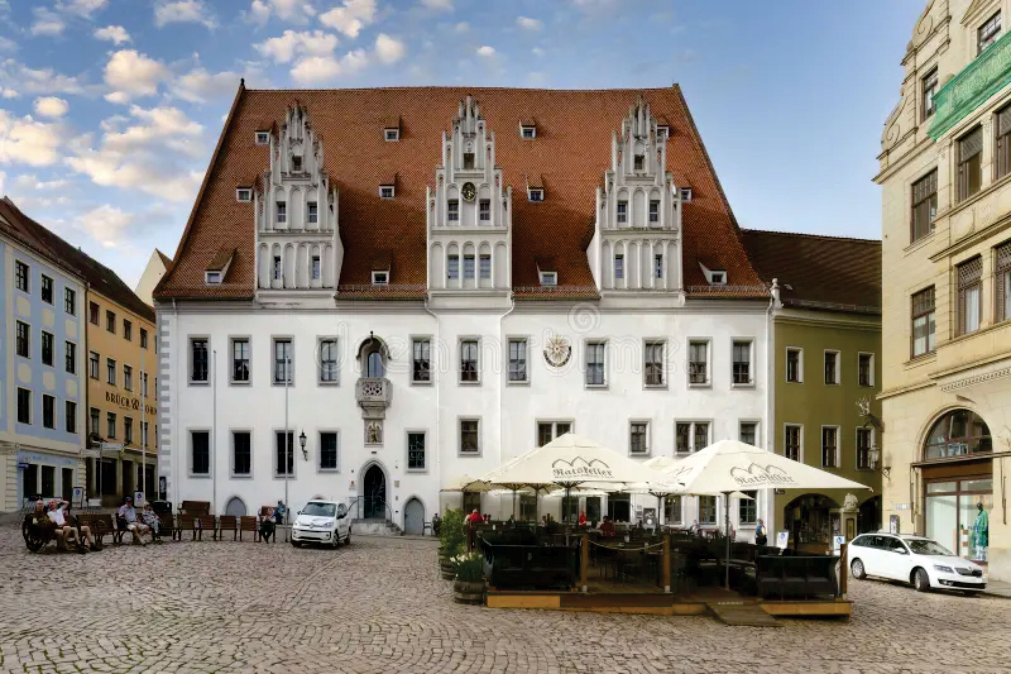 Nesta imagem atual da principal praça da cidade, a Praça do Mercado, é possível reconhecer a câmara municipal de Meissen, construída entre 1470 e 1486, que aparece visivelmente delineada na pintura.