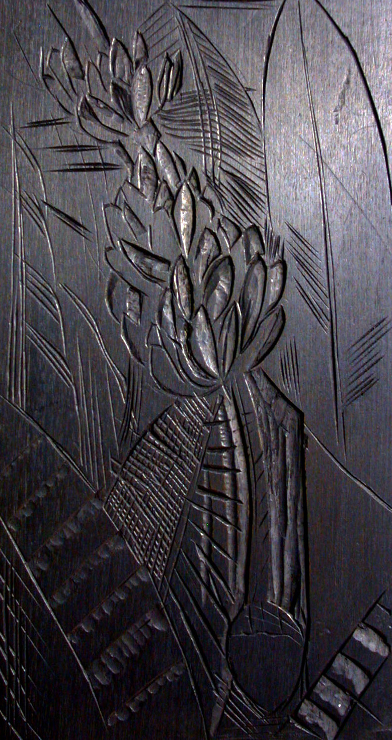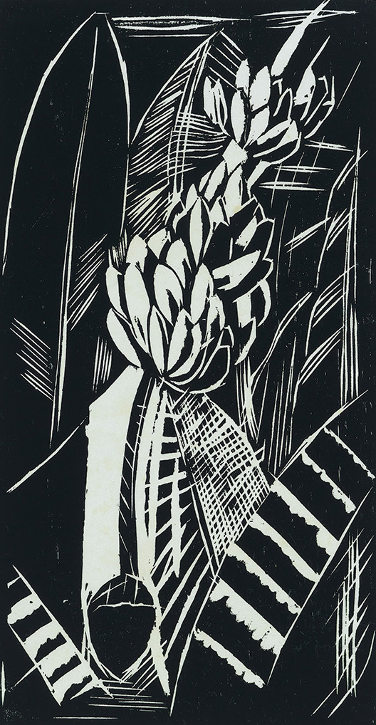 A gravura destaca a inflorescência da bananeira, com engaço, cacho, ráquis e coração – na visão exotista, as partes mais “estranhas” da planta. Estaria Segall se entregando à atração sensual do estrangeiro pelos trópicos? A presença do cacho sinaliza que sim; mas a opção pela xilogravura, com suas formas duras, assim como os contrastes e linhas cortantes que constroem o cacho, problematizam a ideia da fruta carnuda. Além disso, outras partes da planta estão presentes: folhas e caules cujas figuras se delineiam a custo, decompostos em texturas variadas. Tal fragmentação, porém, não é definitiva, pois a composição articula as partes da planta em uma nova unidade – não é a da bananeira naturalisticamente representada, mas uma unidade pictórica criada pelo enquadramento e pelo tensionamento da hierarquia entre figura e fundo.