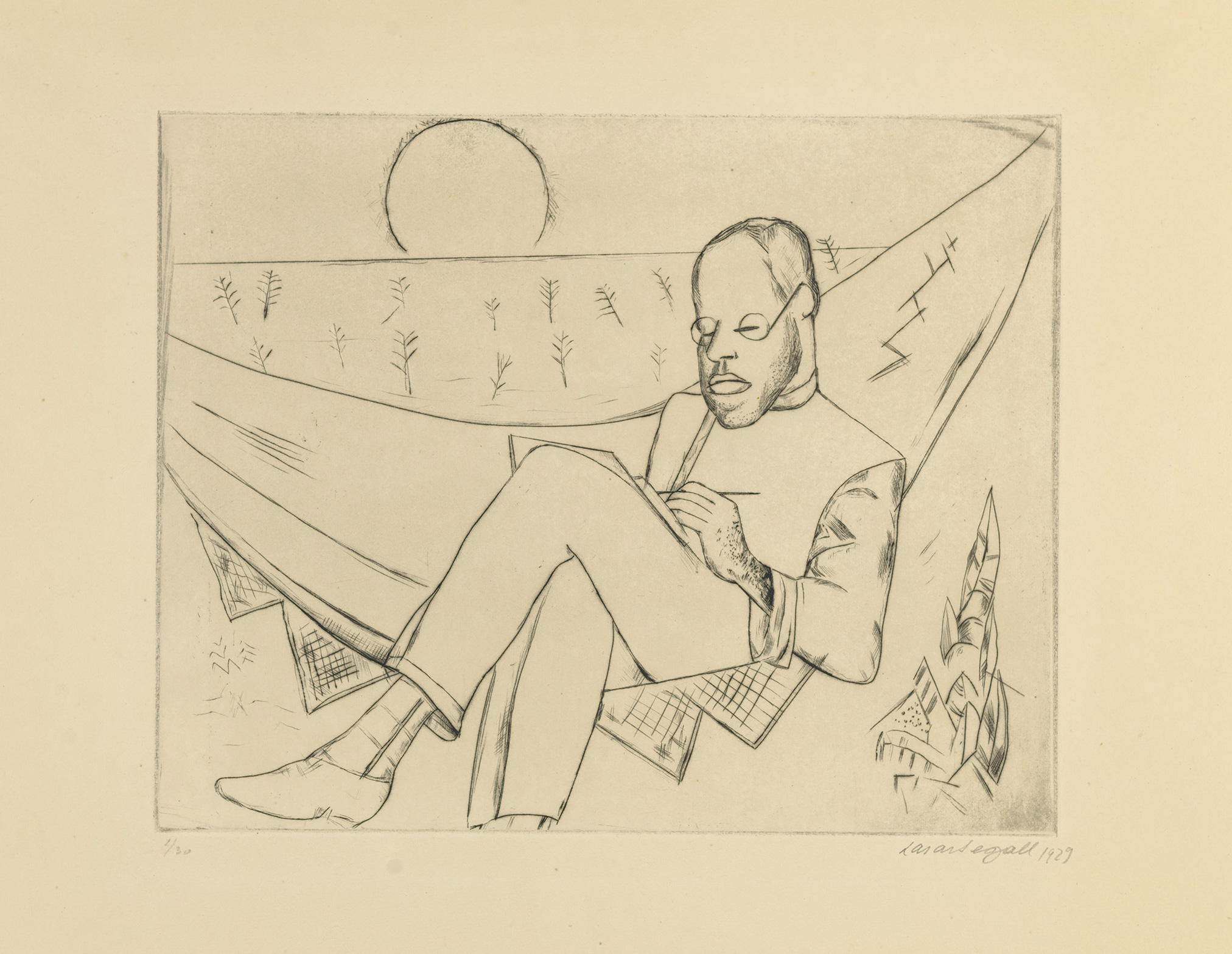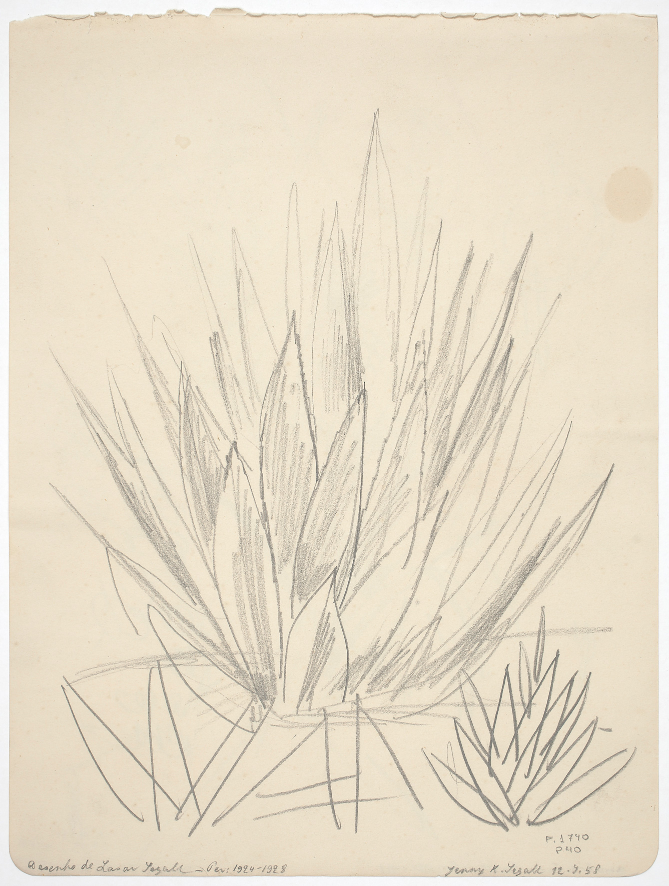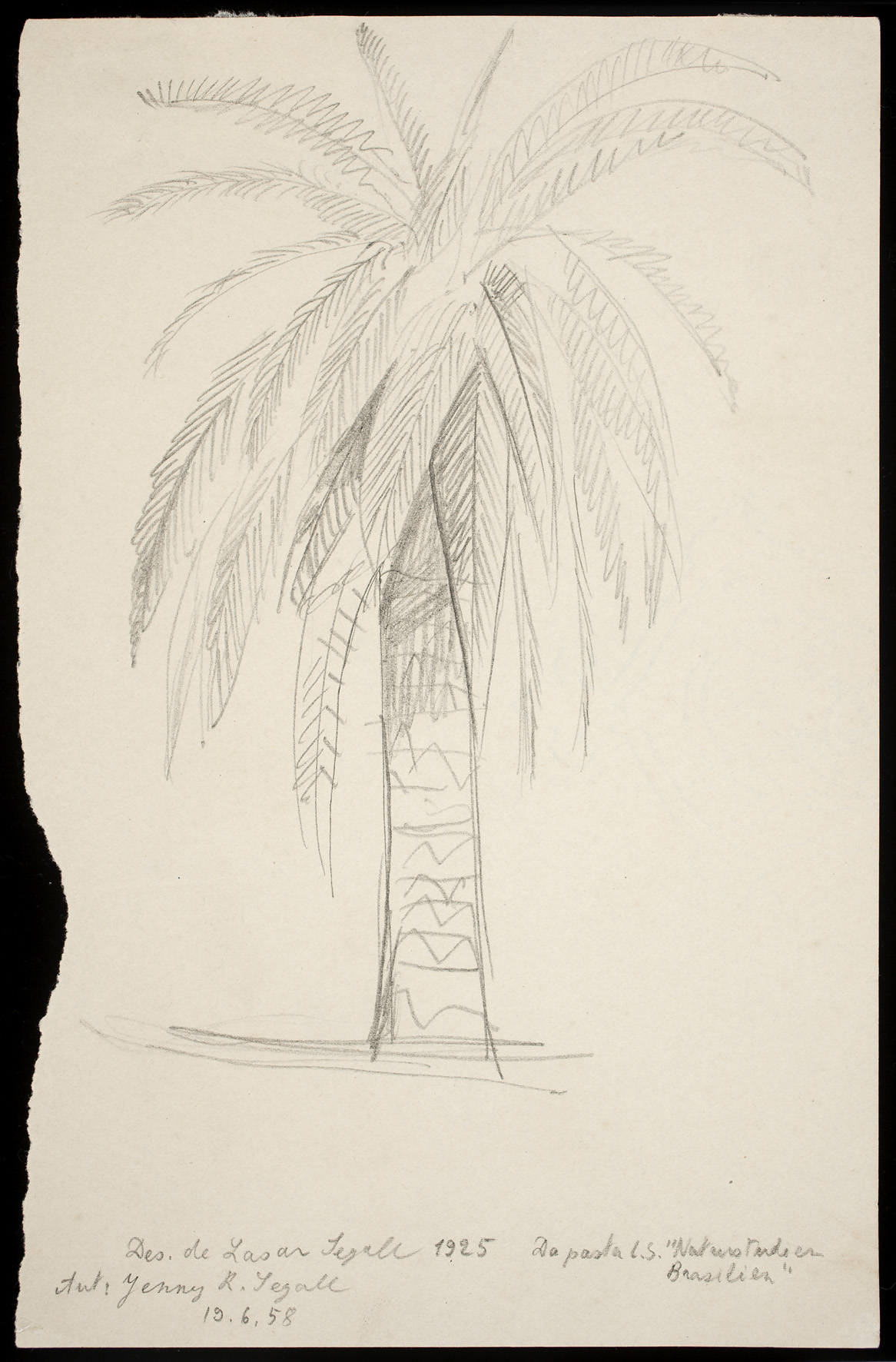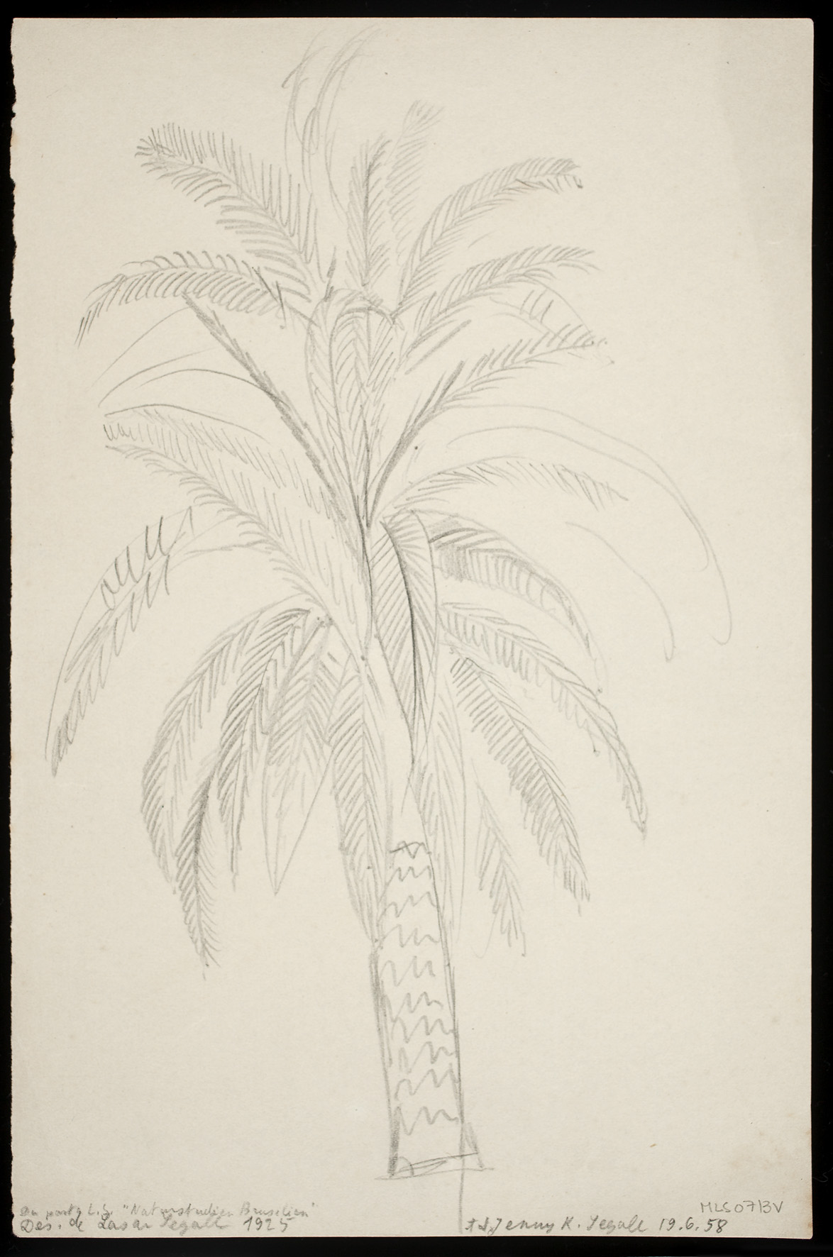 No final de 1912, Lasar Segall, nascido na cidade de Vilnius na Lituânia, deixa a Alemanha em sua primeira viagem em direção ao Brasil. Nesse momento inicial, o chamado da novidade, o imaginário do exotismo e o reconhecimento do outro lhe afetavam. No navio, identifica-se com os imigrantes. Ao aportar no Rio de Janeiro, se encanta com a paisagem e os elementos da terra: o povo, a dança, o sol, o solo, a vegetação. Uma década mais tarde, em 1923, decide se estabelecer definitivamente no país, o que traz mudanças à sua obra, conformando o que se convencionou chamar de “fase brasileira”. Nesse período, novos gêneros artísticos e procedimentos pictóricos começam a ser explorados – com a valorização de cores luminosas, figuras de contornos definidos e uma espacialidade acolhedora. Realiza desenhos de observação que identificam, com artística precisão ou, ainda, com uma expressividade científica, as “fantásticas formas ornamentais” de plantas como cactos, abacaxis, agaves – além, é claro, das palmeiras, símbolos por excelência do ideário sobre a “tropicalidade”.
