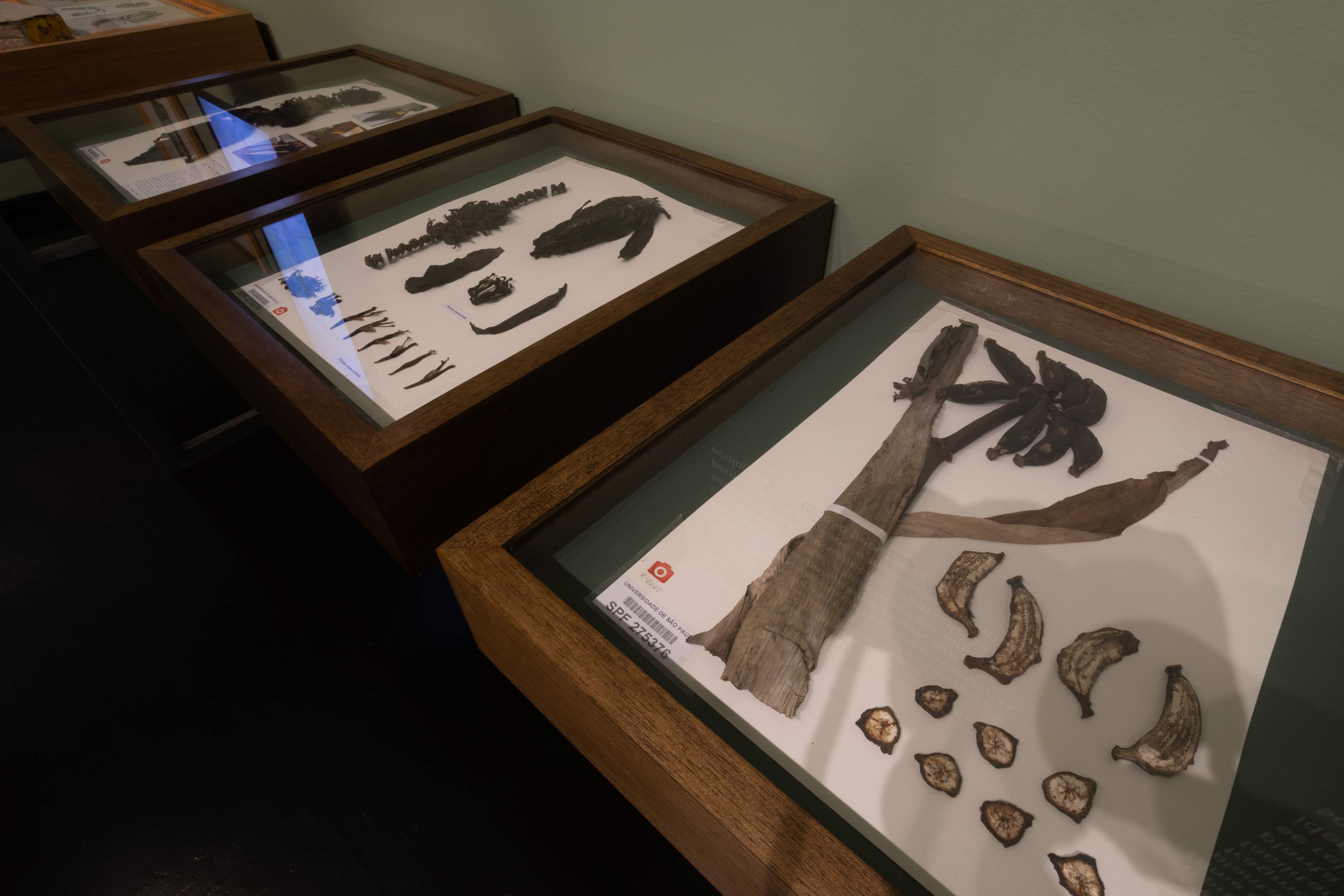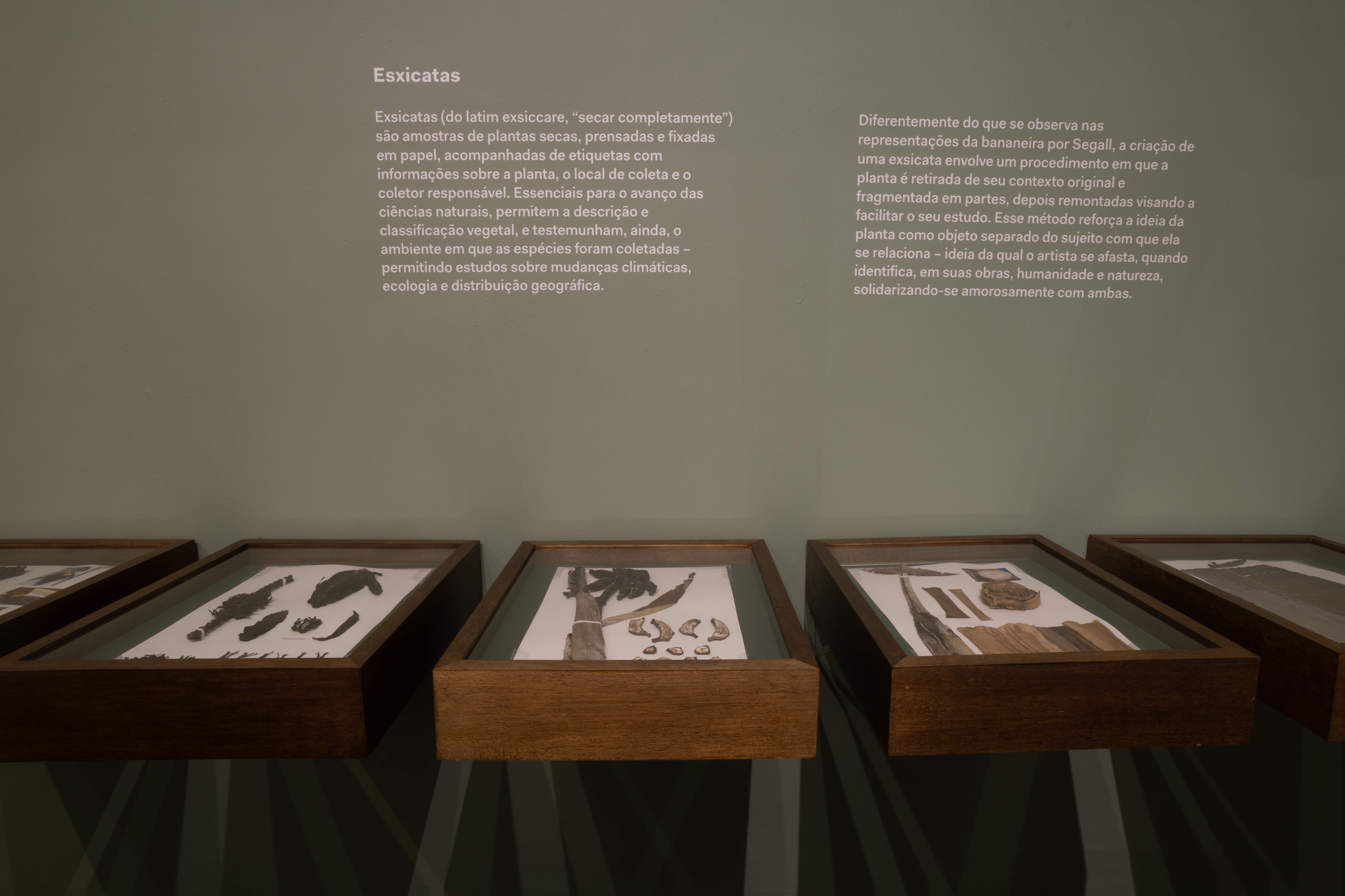 Exsicatas (do latim exsiccare, “secar completamente”) são amostras de plantas secas, prensadas e fixadas em papel, acompanhadas de etiquetas com informações sobre a planta, o local de coleta e o coletor responsável. Essenciais para o avanço das ciências naturais, permitem a descrição e classificação vegetal, e testemunham, ainda, o ambiente em que as espécies foram coletadas – permitindo estudos sobre mudanças climáticas, ecologia e distribuição geográfica. Diferentemente do que se observa nas representações da bananeira por Segall, a criação de uma exsicata envolve um procedimento em que a planta é retirada de seu contexto original e fragmentada em partes, depois remontadas visando a facilitar o seu estudo. Esse método reforça a ideia da planta como objeto separado do sujeito com que ela se relaciona – ideia da qual o artista se afasta, quando identifica, em suas obras, humanidade e natureza, solidarizando-se amorosamente com ambas.