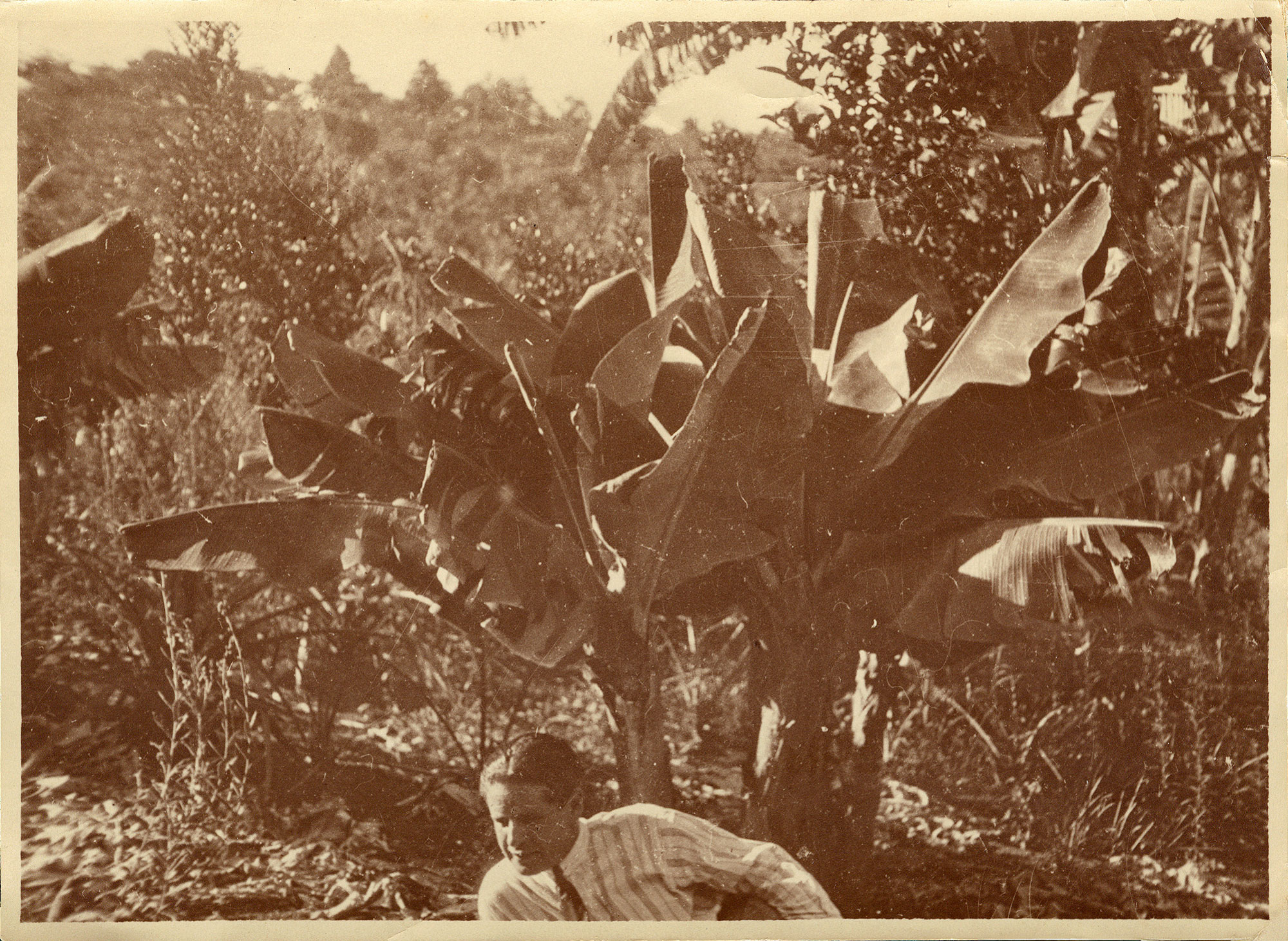 A figura de Segall é cortada ao meio pelo olhar do fotógrafo – que prioriza, ao centro, um grupo de bananeiras lustrosa e sem frutos. Ao fundo, os morros desmatados e a vegetação variada indicam uma paisagem de roças. A postura do artista é descontraída, e o fato de estar abaixado parece significar uma vontade de compartilhar o espaço com as bananeiras e com a paisagem – talvez uma tentativa de inserção de si próprio na nova terra. A ligação com Bananal se dá pela estrutura compositiva horizontal e organizada em três planos – na pintura, porém, Segall funde o segundo e o terceiro planos, sintetizando plantas e paisagem na imagem do bananal.