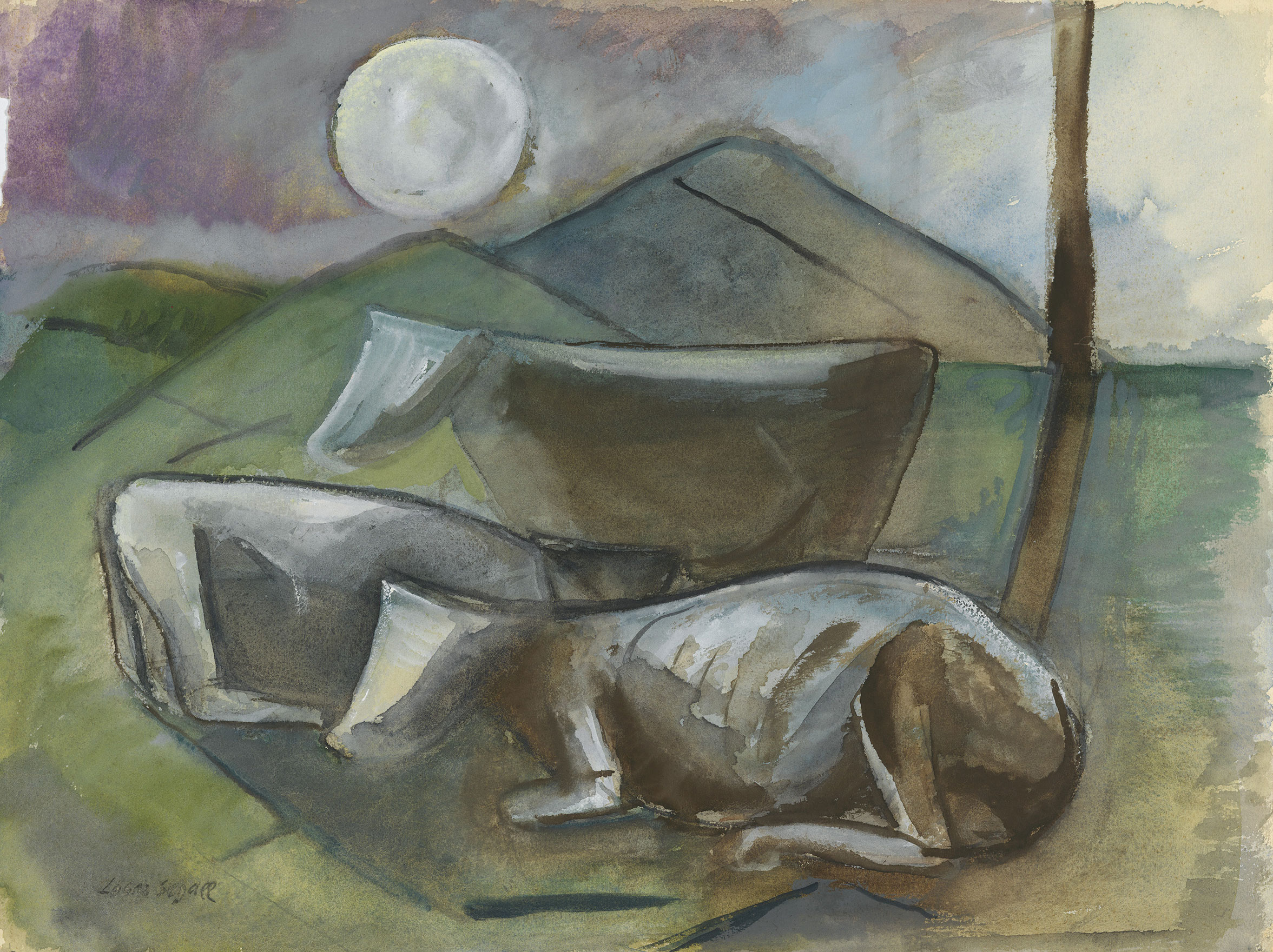 Nas décadas de 1930 e 1940, diante da ascensão de fascismos, genocídios e guerras, a obra de Lasar Segall ganha contornos mais claramente políticos. Ele começa a produzir e exibir o que chamou de “grandes composições sociais”. Em contrapartida, buscando refúgio e alívio, interessa-se por paisagens campestres, como as que encontrou na cidade de Campos do Jordão. As paisagens servem, dessa maneira, a funções contrastantes: nas obras sociais, pontuam o drama que se desenvolve em primeiro plano; nas imagens campestres, oferecem o consolo à alma fatigada pela tensão das catástrofes históricas.