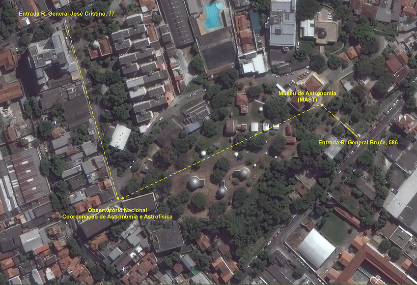 The Observatório Nacional is located in the neighborhood of São Cristóvão, Rio de Janeiro - RJ, close to the Centro de Tradições Nordestinas, also known as Feira de São Cristóvão. The Observatório Nacional campus is approximately 30 minutes from the Galeão and Santos Dumont airports and 60 minutes from the Copacabana and Ipanema beaches.