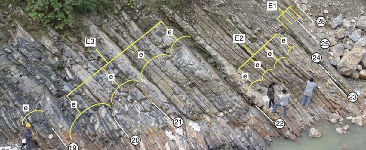 Ciclos de Milankovitch identificados no registro sedimentar da Formação Dalong, sul da China (Wu et al., 2013). As indicações "E" e "e" significam, respectivamente, o registro nas rochas dos ciclos orbitais de excentricidade longa (405 mil anos) e excentricidade curta (cerca de 100 mil anos).