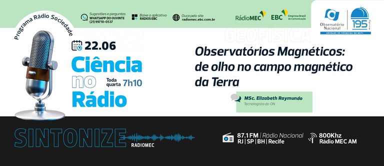 O "Ciência no Rádio" é um dos quadros do programa "Rádio Sociedade" e vai ao ar todas às quartas-feiras às 7h10min da manhã (Hora Legal de Brasília). O programa é resultado de uma parceria do ON com a Rádio, criada em 2015 para levar ao público informações científicas ligadas às três áreas de atuação do ON: astronomia e astrofísica, geofísica, metrologia em tempo e frequência. São mais de 300 programas ao longo desses anos! E todos estão disponíveis em nosso site Clique aqui para ouvir.