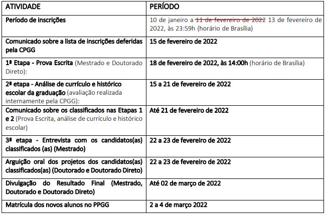 O processo de seleção para o Doutorado Direto será constituído por três etapas. A primeira é a prova escrita obrigatória a ser realizada no dia 18 de fevereiro de 2022, às 14:00h (horário de Brasília) utilizando a plataforma Google Forms, com duração de quatro horas.