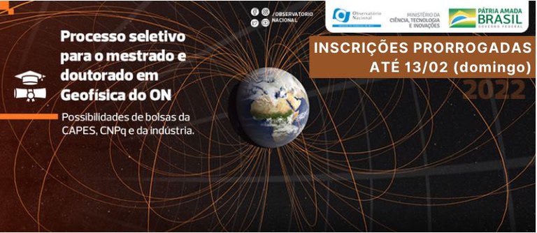 Foram prorrogadas até o dia 13 de fevereiro (domingo), às 23h59 (Horário de Brasília), as inscrições para o Programa de Pós-Graduação em Geofísica do Observatório Nacional, unidade de pesquisa vinculada ao Ministério da Ciência, Tecnologia e Inovações (MCTI).