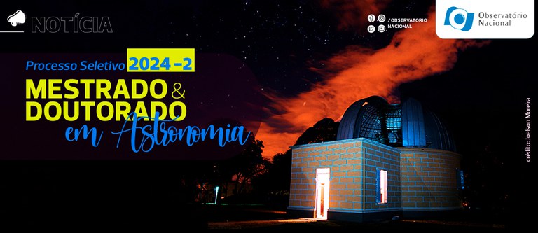 Estão abertas até o dia 20 de junho de 2024 as inscrições para o Programa de Pós-Graduação em Astronomia do Observatório Nacional (PPGA/ON/MCTI) com ingresso no 2º Semestre de 2024.