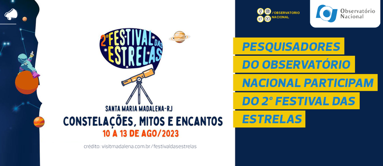 Entre os dias 10 e 13 de agosto, pesquisadores do Observatório Nacional, unidade de pesquisa vinculada ao Ministério da Ciência, Tecnologia e Inovação (ON/MCTI), participarão do 2º Festival das Estrelas, realizado pelo município de Santa Maria Madalena, no Rio de Janeiro.