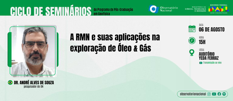 O evento começará às 15h (horário de Brasília) no Auditório Yeda Ferraz e terá transmissão ao vivo pelo canal do YouTube do Observatório Nacional. O tema será: “A RMN e suas aplicações na exploração de Óleo & Gás”. Para falar sobre o assunto foi convidado o Dr. André Alves de Souza (ON / MCTI).